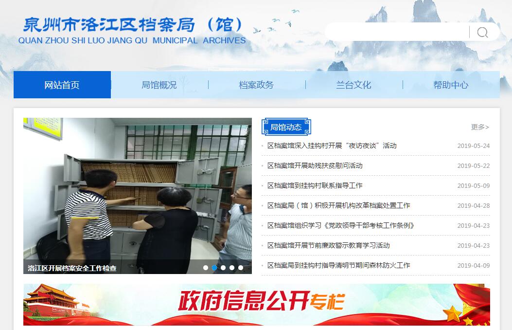 泉州市洛江區(qū)于1997年6月經國務院批準設立。同年8月從原鯉城區(qū)檔案館分流2名工作人員到洛江區(qū)組建新區(qū)檔案館。1998年1月13日正式設立了“泉州市洛江區(qū)檔案館”,加掛檔案局牌子,為區(qū)委直屬正科級事業(yè)單位,核定編制4人。2000年12月,區(qū)委同意將區(qū)檔案館列入?yún)⒄諊夜珓諉T制度管理范圍。其主要職責是:1、貫徹實施《檔案法》及檔案工作的法律、法規(guī)和方針政策,進行行政執(zhí)法監(jiān)督;制定實施全區(qū)檔案事業(yè)發(fā)展規(guī)劃和檔案工作制度。2、審批外國組織和個人以及華僑、港澳臺同胞利用區(qū)檔案館館藏檔案的申請。3、調查處理違法案件,監(jiān)管對國家和社會具有保存價值或應當保密的集體和個人的檔案。4、對全區(qū)機關、團體、企事業(yè)單位和其他組織的檔案工作進行監(jiān)督和指導,對檔案人員進行業(yè)務培訓,組織全區(qū)檔案信息資源開發(fā)工作。5、集中統(tǒng)一管理區(qū)級各機關、團體及所屬單位重要的檔案資料,保守黨和國家機密,維護檔案的完整,確保檔案資料的安全。6、負責接收區(qū)級各機關、團體及所屬單位的檔案資料,研究并組織實施館藏檔案的保管、整理、編目、統(tǒng)計、鑒定、解密、利用、開放等工作;做好檔案史料的編輯出版工作,推進檔案工作的科學管理和現(xiàn)代化建設,為社會各方面提供服務。7、完成區(qū)委、區(qū)政府及上級檔案部門交辦的有關事項。