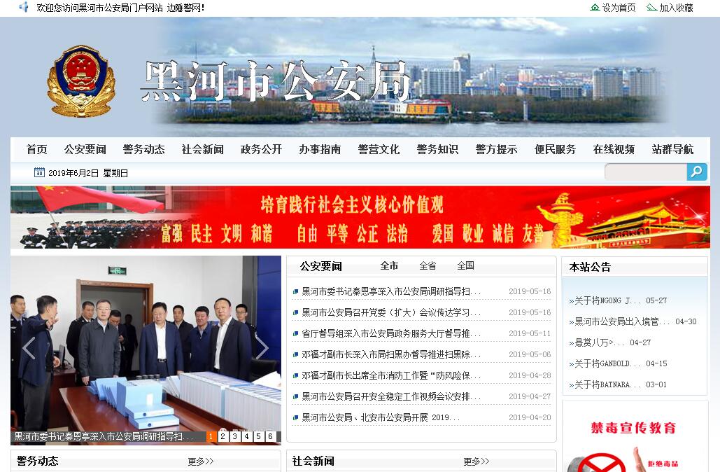 黑河市公安局“邊陲警網(wǎng)”建于2012年,是黑河市公安局在互聯(lián)網(wǎng)開(kāi)設(shè)的門(mén)戶(hù)網(wǎng)站。主要職責(zé)是:轉(zhuǎn)載全國(guó)公安機(jī)關(guān)可對(duì)外公開(kāi)警務(wù)信息,發(fā)布全市公安機(jī)關(guān)可對(duì)外公開(kāi)警務(wù)信息,向公眾提供涉及公安機(jī)關(guān)的信息查詢(xún)服務(wù),推進(jìn)警務(wù)公開(kāi),開(kāi)展警民交流,密切警民聯(lián)系,提升公安工作效率。“邊陲警網(wǎng)” 旨在通過(guò)構(gòu)建全新的“便民、為民、利民、惠民”服務(wù)平臺(tái),深化公安機(jī)關(guān)社會(huì)管理創(chuàng)新,推進(jìn)警務(wù)公開(kāi),密切警民關(guān)系,延伸服務(wù)領(lǐng)域,促進(jìn)全市公安工作和隊(duì)伍建設(shè)的提檔升級(jí)和發(fā)展進(jìn)步。