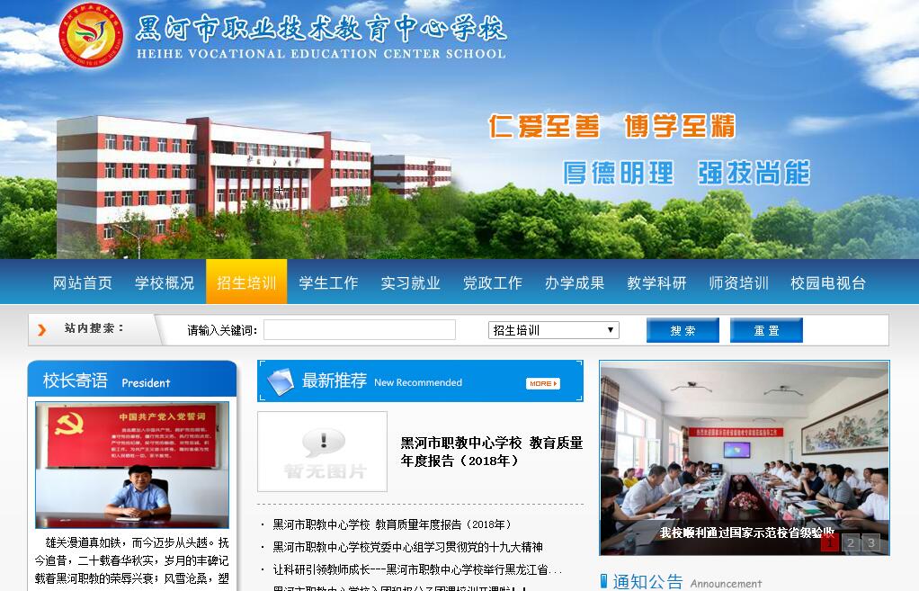 黑河市職教中心學校成立于1996年,是我國北端邊境線上唯一一所國家級重點中等職業(yè)學校,是對俄羅斯的窗口學校,是一所集普通中專、職業(yè)高中、技工教育、成人專本科函授及各類短期培訓為一體的多功能、多形式的中等職業(yè)學校。 學校占地326.4畝,建筑面積7.4425萬平方米。學?,F(xiàn)有教職工297人,專任教師199人,其中副高級職稱教師105人,“雙師型”教師109人,有國家級職教名師1人,省級專業(yè)帶頭人11人,市級專業(yè)帶頭人4人,市級骨干教師8人?,F(xiàn)有在校生5311人。 學校依據(jù)區(qū)域經(jīng)濟、產(chǎn)業(yè)結構調整及經(jīng)濟發(fā)展方式的轉變,淘汰飽和專業(yè),發(fā)展護理、計算機、商務俄語、俄語護理、烹飪、電子技術應用、工藝美術、森林管護等骨干和特色專業(yè),嫁接了以護理、計算機為骨干專業(yè)群的中醫(yī)護理、計算機網(wǎng)絡技術、計算機平面設計等復合專業(yè)。學?,F(xiàn)有醫(yī)護、計算機、機電、旅貿(mào)商、藝術、農(nóng)林六大類實訓基地,其中計算機專業(yè)實訓基地為國家級實訓基地,護理專業(yè)實訓基地有省內(nèi)一流的解剖標本室、先進的醫(yī)學機能虛擬實驗室、各種先進的臨床護理模型,商務俄語專業(yè)有現(xiàn)代化的語音室,電子技術應用專業(yè)有先進的電氣運行實訓室、電子整機實訓室,幼兒教育專業(yè)有一流的電鋼琴室、電子琴室,共有實訓室41個。同時學校還與黑河市第一人民醫(yī)院等9家二級乙等以上醫(yī)院建立了醫(yī)護類校外實訓基地,與黑龍江省通信公司黑河分公司、哈爾濱奔圖數(shù)碼科技公司、北方水泥有限公司、黑河熱電廠、黑河市實驗幼兒園、教育幼兒園、華富量販、商貿(mào)大酒店、國際飯店等34家企業(yè)建立了實訓基地。分別接納計算機網(wǎng)絡技術、電子技術應用、幼兒教育、商務俄語、烹飪、工藝美術等專業(yè)學生實訓。 15年來,學校為地方經(jīng)濟發(fā)展培養(yǎng)了20000多名實用技術人才,有500多名中職生對口升入專本科院校,完成社會培訓10萬人次,培養(yǎng)的實用技術人才遍布全市各行各業(yè),60%以上的畢業(yè)生成為一線業(yè)務骨干,醫(yī)護專業(yè)的畢業(yè)生占全市醫(yī)療衛(wèi)生單位醫(yī)護人員的70%。1999年,被黑龍江省教委授予“黑龍江省教育系統(tǒng)教書育人、管理育人、服務育人先進集體”;2000年,晉升為國家級重點校,被黑河市政府命名為市級文明單位;2002年,被黑河市政府命名為市級文明單位標兵;2004年,被黑龍江省教育廳指定為“全省農(nóng)村勞動力轉移教育培訓基地”;2005年,被黑龍江省教育廳評為省級重點中等職業(yè)學校;2006年,被黑龍江省人民政府授予職業(yè)教育先進單位。 學校黨委抓住職業(yè)教育的大好形勢,調整辦學方向,重新進行定位,提出了“以市場為導向,以服務為宗旨,以就業(yè)為目的,以能力為本位,以質量求信譽,以特色求發(fā)展,服務社會經(jīng)濟、服務學生就業(yè)”的辦學理念;確立了“以更新觀念為前提,以創(chuàng)新為動力,以改善辦學條件和強化師資隊伍建設為基礎,以科學管理和優(yōu)質服務為手段,以提高教學質量為核心,以實現(xiàn)升學和就業(yè)為目的,增強學校主動服務經(jīng)濟社會和學生需求能力,使學校逐步走上招生、教學、管理、服務、就業(yè)相互促進,質量、規(guī)模、效益、特色相互統(tǒng)一的良性循環(huán)軌道”的辦學指導思想。全校教職工在學校黨委的正確領導下,正以飽滿的工作熱情和對職業(yè)教育的無限忠誠,為創(chuàng)建國家級中職示范校而努力!