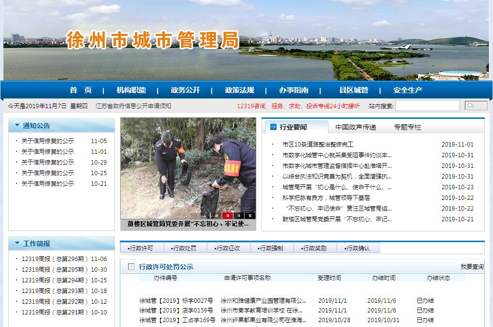 徐州市城市管理局負責貫徹落實中央關(guān)于城市管理工作的方針政策和省委、市委決策部署,在履行職責過程中堅持和加強黨對城市管理工作的集中統(tǒng)一領(lǐng)導(dǎo)。主要職責是:(一)貫徹執(zhí)行國家、省和市有關(guān)市容、環(huán)境衛(wèi)生及城市道路(含公交場站)、橋涵、照明、停車場等市政公用事業(yè)的方針政策、法律、法規(guī)和規(guī)章;依法起草我市相關(guān)法規(guī)、規(guī)章、規(guī)范性文件草案;擬訂有關(guān)政策并組織實施。(二)根據(jù)本市國民經(jīng)濟和社會發(fā)展總體規(guī)劃、城市總體規(guī)劃的要求,擬訂市容、環(huán)境衛(wèi)生及城市道路(含公交場站)、橋涵、照明的發(fā)展規(guī)劃,牽頭制定市容、環(huán)境衛(wèi)生及城市道路(含公交場站)、橋涵、照明等市政公用設(shè)施的年度建設(shè)和養(yǎng)護維修計劃,并組織實施。按照職責分工負責對城市道路養(yǎng)護、維修工程的質(zhì)量進行監(jiān)督檢查。(三)負責全市市容、環(huán)境衛(wèi)生及城市道路(含公交場站)、橋涵、照明、停車場的行政管理,依法負責相關(guān)行政許可和行政審批工作;按照職責分工負責城市道路(含分車帶綠籬、兩側(cè)綠化區(qū)域)、廣場的綠化管理。(四)負責全市市容、環(huán)境衛(wèi)生及城市道路(含公交場站)、橋涵、照明、停車場行業(yè)的監(jiān)督管理;推動環(huán)境衛(wèi)生的社會化服務(wù)工作;參與城市規(guī)劃、建設(shè)中涉及市容和環(huán)境衛(wèi)生項目的論證;參與新建道路、住宅小區(qū)、臨街建筑物、市場設(shè)置及建設(shè)的方案論證、竣工驗收工作;負責市區(qū)固定停車場點的規(guī)范設(shè)置,會同公安等相關(guān)部門負責臨時占道停車場點的審批。(五)負責全市城市管理相對集中行政處罰權(quán)工作的統(tǒng)一管理,依法行使相對集中行政處罰權(quán);受理城市管理行政執(zhí)法案件的行政復(fù)議。(六)負責全市城市管理行政執(zhí)法隊伍的規(guī)范化建設(shè),組織、實施城市管理行政執(zhí)法的督察工作,查處城市管理行政執(zhí)法中的違紀、違規(guī)行為。(七)負責市容、環(huán)境衛(wèi)生及城市道路(含公交場站)、橋涵、照明等城市建設(shè)及運維類經(jīng)費的計劃、使用和管理;牽頭負責垃圾處理費、戶外廣告國有資源有償使用費等的征收、監(jiān)管工作;負責各項經(jīng)費的內(nèi)部審計監(jiān)督。(八)負責全市市容、環(huán)境衛(wèi)生及城市道路(含公交場站)、橋涵、照明、停車場和城市管理信息化等方面科學(xué)技術(shù)的研究、開發(fā)、引進和推廣應(yīng)用。(九)完成市委、市政府交辦的其他事項。