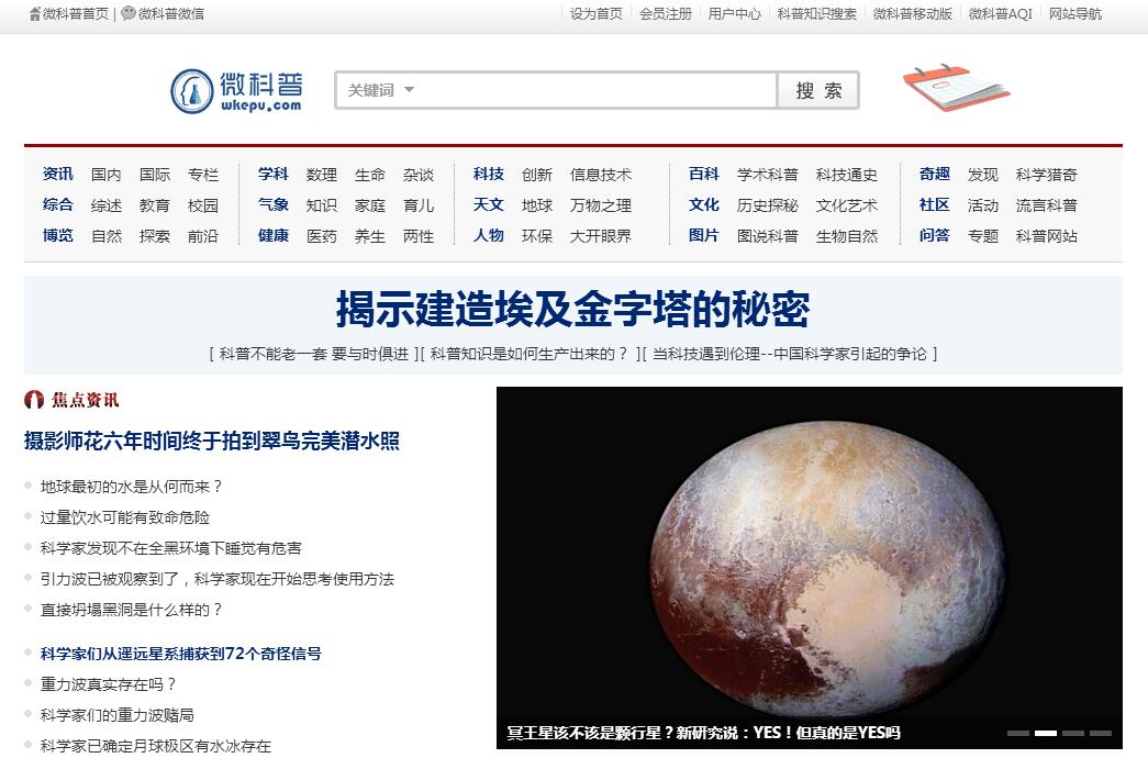 | 網站簡介: 微科普,是專注于科普知識傳播的高層次科普網站。微科普以分享科普知識為宗旨,致力于構建權威的科普知識數(shù)據(jù)庫,以“成為中國科普網站中的一面鏡子”為出發(fā)點,提供負責任、有趣、權威的科普知識,向關注中國科普類資訊的公眾提供科普知識的傳播與服務。微科普是《全球智慧數(shù)據(jù)平臺(GSD)》數(shù)據(jù)源網站,據(jù)《新聞研究導刊》的相關文獻報道,微科普與果殼網、科學松鼠會一起并稱為我國三大科普網站。 |