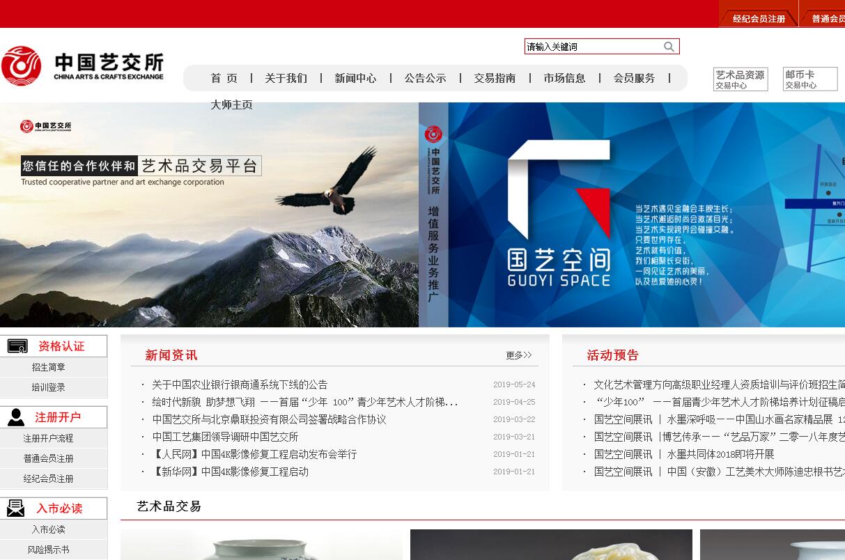中國工藝藝術(shù)品交易所有限公司(以下簡稱中國藝交所)是為落實中央關(guān)于文化大發(fā)展大繁榮的戰(zhàn)略部署,由中央企業(yè)——中國工藝集團(tuán)有限公司發(fā)起、中央文資辦國家文化發(fā)展基金資助、全國清理整頓各類交易場所部際聯(lián)席會議批準(zhǔn)設(shè)立的全國性藝術(shù)品現(xiàn)貨交易平臺。中國藝交所秉承“為中華文化傳承服務(wù),為文化產(chǎn)業(yè)發(fā)展服務(wù)”的宗旨,通過與第三方服務(wù)機構(gòu)深度合作,積極探索“藝術(shù)+金融+科技”的創(chuàng)新發(fā)展模式,充分發(fā)揮行業(yè)優(yōu)勢和稅率優(yōu)勢,為藝術(shù)品市場提供確權(quán)公證、鑒定估值、保管保險、展覽展示、見證交易、資金清算、藝術(shù)品登記、質(zhì)押融資等一站式藝術(shù)金融服務(wù)。目前已形成藝術(shù)品交易、高端文創(chuàng)產(chǎn)品開發(fā)、藝術(shù)銀行、老電影修復(fù)發(fā)行、人才選拔培訓(xùn)、文化項目咨詢和衍生業(yè)務(wù)服務(wù)等業(yè)務(wù)板塊。作為中央國有資本發(fā)起設(shè)立的文化藝術(shù)類交易所,中國藝交所緊緊圍繞文化藝術(shù)品流通服務(wù),助力實體經(jīng)濟(jì)發(fā)展,全力打造藝術(shù)品創(chuàng)作者、投資者和收藏者滿意和信賴的藝術(shù)品財富管理綜合服務(wù)平臺。
