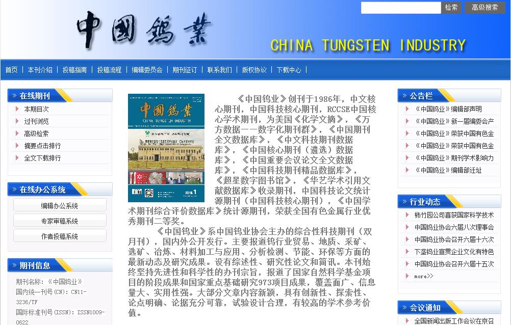 《中國鎢業(yè)》雜志社有限公司經(jīng)國家新聞出版總署、國家工商行政管理總局、北京市工商行政管理局海淀分局批準(zhǔn),于2009年8月正式注冊(cè)成立?!吨袊u業(yè)》系中國鎢業(yè)協(xié)會(huì)主辦的綜合性科技期刊(雙月刊),國內(nèi)外公開發(fā)行。主要報(bào)道鎢行業(yè)貿(mào)易、地質(zhì)、采礦、選礦、冶煉、材料加工與應(yīng)用、分析檢測(cè)、節(jié)能、環(huán)保等方面的最新動(dòng)態(tài)及研究成果。設(shè)有綜述性、研究性論文和簡訊。本刊始終堅(jiān)持先進(jìn)性和科學(xué)性的辦刊宗旨,報(bào)道了國家自然科學(xué)基金項(xiàng)目的階段成果和國家重點(diǎn)基礎(chǔ)研究973項(xiàng)目成果,覆蓋面廣、信息量大、實(shí)用性強(qiáng)。大部分文章內(nèi)容新穎,具有創(chuàng)新性、探索性、論點(diǎn)明確、論據(jù)充分可靠,試驗(yàn)設(shè)計(jì)合理,有較高的學(xué)術(shù)參考價(jià)值。 《中國鎢業(yè)》為中文核心期刊,中國科技核心期刊,RCCSE中國核心學(xué)術(shù)期刊,被美國《化學(xué)文摘》,《萬方數(shù)據(jù)——數(shù)字化期刊群》,《中國期刊全文數(shù)據(jù)庫》,《中文科技期刊數(shù)據(jù)庫》,《中國核心期刊(遴選)數(shù)據(jù)庫》,《中國重要會(huì)議論文全文數(shù)據(jù)庫》,《中國科技期刊精品數(shù)據(jù)庫》,《超星數(shù)字圖書館》,《華藝學(xué)術(shù)引用文獻(xiàn)數(shù)據(jù)庫》收錄期刊,中國科技論文統(tǒng)計(jì)源期刊(中國科技核心期刊),《中國學(xué)術(shù)期刊綜合評(píng)價(jià)數(shù)據(jù)庫》統(tǒng)計(jì)源期刊,榮獲全國有色金屬行業(yè)優(yōu)秀期刊二等獎(jiǎng)。
