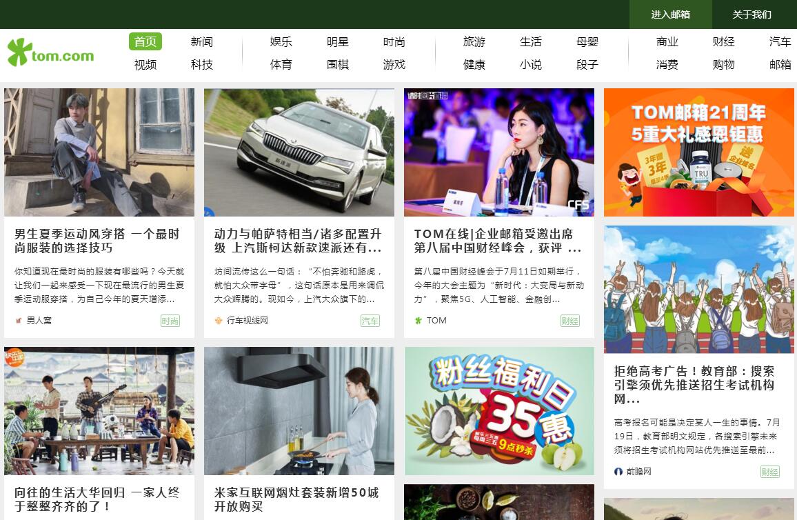 | 網(wǎng)站簡(jiǎn)介: TOM網(wǎng)(www.tom.com)是一款輕奢即時(shí)資訊平臺(tái),它為用戶推薦最新的娛樂資訊、時(shí)尚前瞻的搭配指南,是國內(nèi)了解娛樂、時(shí)尚資訊最便捷的途徑之一,內(nèi)容涵蓋娛樂時(shí)尚、體壇賽事、要聞事件、汽車科技、母嬰消費(fèi)、購物生活、健康旅游、游戲郵箱、段子的頻道信息。 |