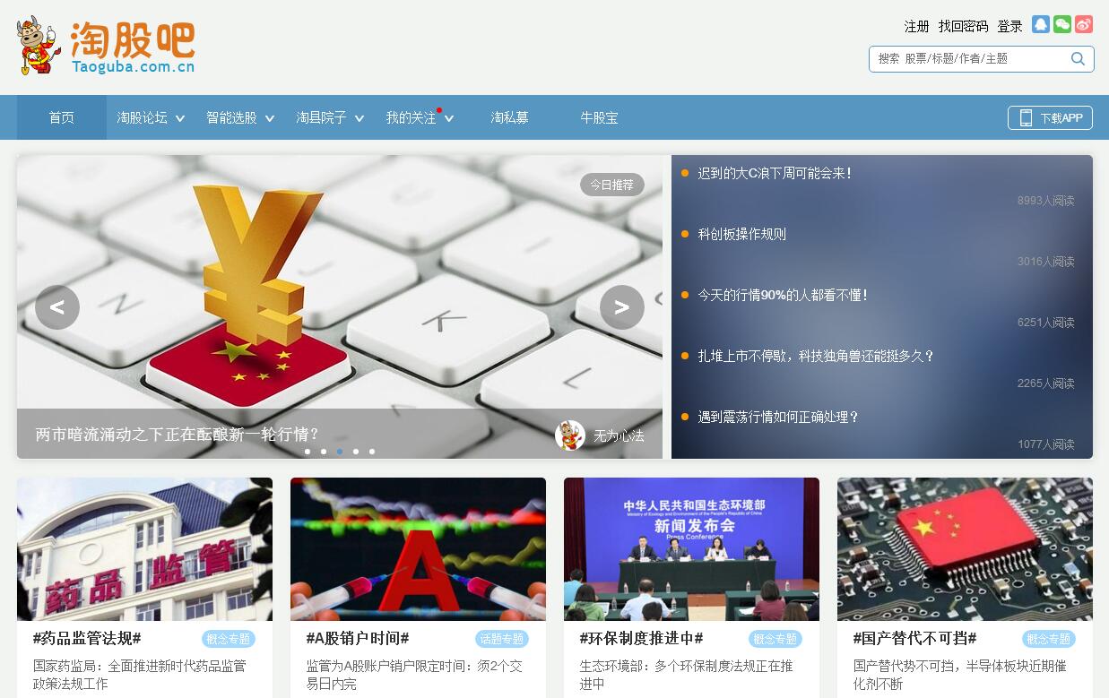 | 網(wǎng)站簡介: 淘股吧中國大陸知名的移動互聯(lián)投資社交化平臺,服務(wù)于證券市場上億的證券投資者,在淘股吧上活躍著上百萬的職業(yè)投資者,每天分享豐富證券交易、投 資心得。投資者可在淘股吧上認識投資高手,訂閱自選股信息,包括公告、新 聞、研報、討論、股吧、高手操盤、熱點主題等動態(tài)信息,以加強股票跟蹤, 獲得超額收益,促進好友溝通。 |