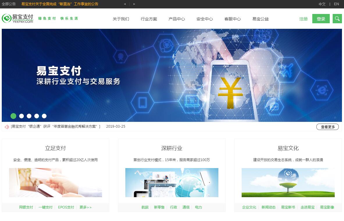 易寶支付(YeePay.com)是中國(guó)行業(yè)支付的先行者,深耕行業(yè)支付和交易服務(wù)。易寶支付于2003年8月8日成立,總部位于北京,在上海、廣東、江蘇、福建、廣西、天津、云南、四川、浙江、山東、陜西等設(shè)有30家分公司。自公司成立以來,易寶支付秉承成就客戶、極致服務(wù)、實(shí)事求是、開放分享的核心價(jià)值觀,以交易服務(wù)改變生活為使命,致力成為世界一流的交易服務(wù)平臺(tái),領(lǐng)跑電子支付、移動(dòng)互聯(lián)和互聯(lián)網(wǎng)金融。易寶支付作為行業(yè)支付專家,2006年便首創(chuàng)了行業(yè)支付模式,陸續(xù)推出了網(wǎng)上在線支付、信用卡無卡支付、POS支付、一鍵支付等創(chuàng)新產(chǎn)品,先后為航空旅游、行政教育、電信、保險(xiǎn)、新零售、消費(fèi)金融、互金、跨境等眾多行業(yè)提供了量身定制的行業(yè)解決方案,為產(chǎn)業(yè)轉(zhuǎn)型及行業(yè)變革做出了積極貢獻(xiàn),并保持行業(yè)領(lǐng)先地位。2011年5月,易寶支付獲得首批央行頒發(fā)的支付牌照,并于2016年首批成功續(xù)展;2013年10月,獲得國(guó)家外匯管理局批準(zhǔn)的跨境支付業(yè)務(wù)許可證。面對(duì)如今的移動(dòng)支付大潮,易寶支付創(chuàng)新推出移動(dòng)支付產(chǎn)品“一鍵支付”,發(fā)布了針對(duì)O2O行業(yè)的解決方案之一掌柜通,助力華為錢包打造生態(tài)體系,在移動(dòng)支付領(lǐng)域持續(xù)保持領(lǐng)先地位。2016年,易寶支付成為首批蘋果公司認(rèn)證通過的安全支付服務(wù)提供商,支持商戶App實(shí)現(xiàn)Apple Pay服務(wù),助力國(guó)航成為國(guó)內(nèi)首家支持Apple Pay的航空公司。2017年,易寶支付創(chuàng)新推出“銀管通”產(chǎn)品,助力網(wǎng)貸平臺(tái)與銀行實(shí)現(xiàn)高效資金存管對(duì)接,并在第六屆中國(guó)金融科技峰會(huì)上斬獲“2017年度十佳支付平臺(tái)”。同年7月,易寶支付成為新華社金融研究中心調(diào)研基地。成立15年來,易寶支付服務(wù)的商家包括百度、京東、360、完美世界、中國(guó)聯(lián)通、中國(guó)電信、中國(guó)國(guó)際航空公司、中國(guó)南方航空公司、中國(guó)東方航空公司、攜程網(wǎng)、途牛旅游網(wǎng)、中國(guó)人民財(cái)產(chǎn)保險(xiǎn)、陽(yáng)光保險(xiǎn)、掌合天下等,并長(zhǎng)期與中國(guó)工商銀行、中國(guó)農(nóng)業(yè)銀行、中國(guó)銀行、中國(guó)建設(shè)銀行、中國(guó)銀聯(lián)、Visa、MasterCard等近百家金融機(jī)構(gòu)達(dá)成戰(zhàn)略合作關(guān)系。易寶支付在業(yè)界樹立了良好的口碑,先后獲得包括中國(guó)移動(dòng)支付最具影響力企業(yè)、最佳電子支付平臺(tái)、中國(guó)互聯(lián)網(wǎng)100強(qiáng)、十佳互聯(lián)網(wǎng)金融營(yíng)銷創(chuàng)新獎(jiǎng)、互聯(lián)網(wǎng)公益創(chuàng)新獎(jiǎng)、最具投資價(jià)值企業(yè),中國(guó)互聯(lián)網(wǎng)金融新銳企業(yè)50強(qiáng),互聯(lián)網(wǎng)金融消費(fèi)者權(quán)益保護(hù)創(chuàng)新企業(yè)獎(jiǎng),十大最勤勉反洗錢支付機(jī)構(gòu)中國(guó)互聯(lián)網(wǎng)金融十大領(lǐng)軍品牌,《銀行家》雜志頒發(fā)的十佳支付創(chuàng)新獎(jiǎng),2017年度創(chuàng)新中國(guó)·金融產(chǎn)業(yè)十大創(chuàng)新力企業(yè),以及被評(píng)選為2016-2017跨境電子商務(wù)年度大獎(jiǎng)之最具人氣跨境電商支付平臺(tái),得到政府和社會(huì)各界的一致認(rèn)可。易寶公益(原易寶公益圈)創(chuàng)建于2008年5月,為所有公益機(jī)構(gòu)提供“零費(fèi)率”服務(wù)。汶川地震時(shí),通過易寶公益募集的善款達(dá)1850余萬元。2015年,易寶公益全新改版,實(shí)現(xiàn)了“和有愛心的人在一起”的互聯(lián)網(wǎng)公益理念。曾有聯(lián)合國(guó)兒童基金會(huì)、中國(guó)扶貧基金會(huì)、壹基金、中華少年兒童慈善救助基金會(huì)、上海真愛夢(mèng)想公益基金會(huì)、青基會(huì)、中國(guó)婦女發(fā)展基金會(huì)等近50家公益機(jī)構(gòu)入駐易寶公益,約200個(gè)公益項(xiàng)目。2016年至今,先后推出生日捐、個(gè)人大病救助捐、企業(yè)捐等公益產(chǎn)品,提供個(gè)性化公益服務(wù)。截至2017年12月,通過易寶公益及使用易寶公益支付接口的累計(jì)網(wǎng)絡(luò)捐贈(zèng)額約7500萬元,有超過5000萬網(wǎng)友關(guān)注。 國(guó)內(nèi)數(shù)十家主流銀行、上千家愛心商戶、媒體、推廣機(jī)構(gòu),都已紛紛加入易寶公益的合作推廣。易寶支付長(zhǎng)期堅(jiān)持“聚焦關(guān)鍵行業(yè)”的核心戰(zhàn)略,多年來致力于助力傳統(tǒng)行業(yè)的互聯(lián)網(wǎng)升級(jí)。未來,易寶支付將繼續(xù)為商家及消費(fèi)者提供更有價(jià)值的產(chǎn)品和服務(wù),共創(chuàng)美好未來。