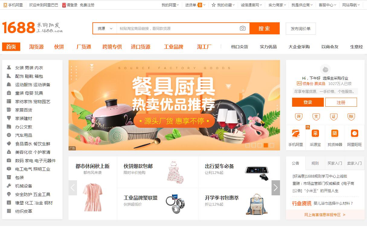 阿里巴巴(1688.com)批發(fā)網(wǎng)是全球企業(yè)間(B2B)電子商務(wù)的著名品牌,為數(shù)千萬網(wǎng)商提供海量商機(jī)信息和便捷安全的在線交易市場,也是商人們以商會友、真實(shí)互動的社區(qū)平臺。目前1688.com已覆蓋原材料、工業(yè)品、服裝服飾、家居百貨、小商品等12個行業(yè)大類,提供從原料--生產(chǎn)--加工--現(xiàn)貨等一系列的供應(yīng)產(chǎn)品和服務(wù)。