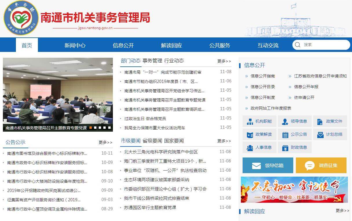 南通市機關事務管理局,為市政府工作部門。其主要職責是:(一)根據黨和國家的有關方針、政策,研究擬定市級機關事務管理工作的具體政策、制度和辦法,并組織實施。(二)負責制定市級行政機關財務、會計制度并監(jiān)督執(zhí)行。負責市級機關和民主黨派機關等單位行政經費預決算、轉撥以及預算外資金的管理。承擔相關會計業(yè)務指導和財務制度審計監(jiān)督等工作。(三)按規(guī)定負責市級機關房地產、辦公設備、交通工具等國有資產的管理工作。(四)負責機關公務用車改革的政策制定和實施推進工作。負責市級機關公務用車的編制、配備、購置、掛牌、報廢、更新經費的申報及車輛資料的管理等工作。(五)制定市級機關房地產管理規(guī)章制度并組織實施。配合相關部門做好市級機關辦公用房的規(guī)劃、投資、建設。負責市級機關辦公用房的分配、調整、置換及維修項目的審核、申報等工作。(六)負責市級機關干部、職工住房制度改革工作,并按照房改精神和政策,審核、發(fā)放市級機關干部、職工住房補貼經費。(七)負責市行政中心和市民服務中心的辦公秩序、物業(yè)管理、安全保衛(wèi)和餐飲服務等后勤管理工作。(八)負責市級公共機構節(jié)能管理工作。負責推進、指導、協(xié)調、監(jiān)督全市公共機構節(jié)能工作。(九)指導并組織實施市級機關以及縣(市)區(qū)機關后勤干部崗位培訓。會同有關部門具體實施市級機關后勤工人的技術培訓工作,并配合做好等級考核工作。(十)會同有關部門研究擬訂機關后勤企事業(yè)單位改革、改制的辦法和措施,并監(jiān)督實施。負責對市級機關以及縣(市)區(qū)機關事務管理工作和深化機關后勤管理體制改革進行業(yè)務指導。(十一)承擔市級重要會議、重大活動的服務工作。承辦市委、市人大、市政府、市政協(xié)交辦的其他事項。