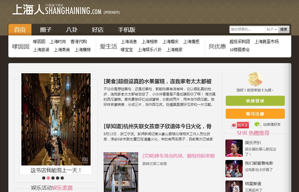 上海19樓是上海最大的城市社區(qū)門戶,是本地人討論美食、旅游、購物、交友、結婚、育兒、租房、招聘等話題的首選網(wǎng)站。