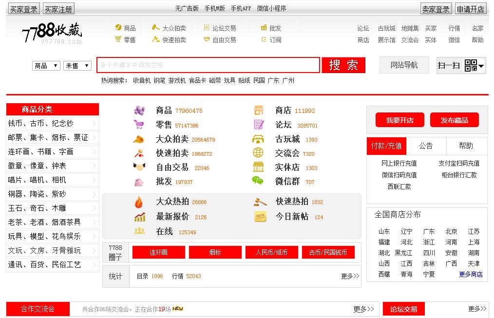 福州九九七七八八網(wǎng)絡(luò)技術(shù)有限公司總部設(shè)立于福建省福州市,網(wǎng)站平臺(tái)于1999年創(chuàng)立,系國(guó)內(nèi)早期創(chuàng)辦網(wǎng)站交易平臺(tái)的企業(yè)之一。歷經(jīng)18年的蓬勃發(fā)展,如今已成為收藏品、藝術(shù)品、舊貨的網(wǎng)站交易平臺(tái)的龍頭企業(yè)。公司現(xiàn)有強(qiáng)大的技術(shù)開發(fā)維護(hù)、網(wǎng)絡(luò)營(yíng)銷、品牌策劃、售后服務(wù)等專業(yè)團(tuán)體。目前公司旗下?lián)碛?788收藏(www.997788.com)、7788商城(www.7788.com)兩個(gè)主營(yíng)網(wǎng)站平臺(tái),與此同時(shí)還有198個(gè)專業(yè)收藏品交易平臺(tái),滿足不同客戶間的多樣化需求。 7788商城(www.7788.com)、及7788收藏(www.997788.com)系收藏品、藝術(shù)品、舊貨網(wǎng)上交易平臺(tái),提供零售、大眾加價(jià)、專場(chǎng)加價(jià)、批發(fā)、自由交易等多種便捷的交易模式,并已開發(fā)手機(jī)APP、手機(jī)網(wǎng)頁(yè)版、電腦版多種平臺(tái)入口,方便客戶的不同需求。提供及時(shí)的供求信息、論壇交流、會(huì)展資訊、收藏知識(shí)、鑒定打假等專業(yè)資訊信息,已成為國(guó)內(nèi)領(lǐng)先的收藏品、藝術(shù)品綜合性網(wǎng)站平臺(tái)??蛻羧后w遍及全國(guó)各省市及全球各大洲的華人華僑。