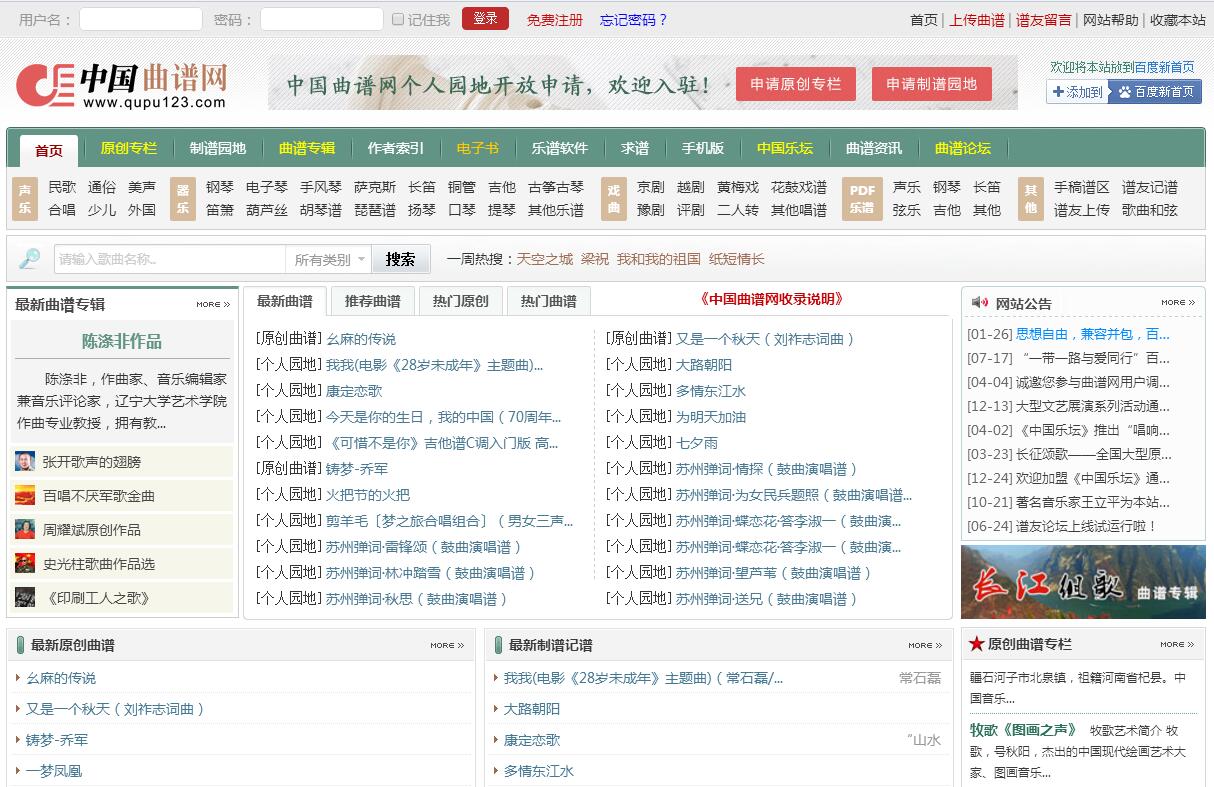 中國曲譜網(wǎng)(www.qupu123.com)創(chuàng)建于2010年4月,是由網(wǎng)友秋葉起舞創(chuàng)建的一個(gè)綜合類曲譜網(wǎng)站。在網(wǎng)絡(luò)上已經(jīng)譜站林立之際,秋葉老師還要堅(jiān)持創(chuàng)建和發(fā)展“中國曲譜網(wǎng)”,是希望盡此微薄之力扭轉(zhuǎn)當(dāng)時(shí)普遍存在的制譜不規(guī)范、記譜不嚴(yán)謹(jǐn)、曲譜旋律及排版錯(cuò)誤等,極易誤導(dǎo)音樂新人的不負(fù)責(zé)任狀態(tài)。秋葉起舞此舉得到了一群熱愛音樂、熱心為譜友服務(wù)的同道支持,先后加入風(fēng)雨、桃李醉春風(fēng)、宮商角徵、珠落玉盤、瓦連金娜、劉書先等諸位具有不同專業(yè)技能的老師參與網(wǎng)站的管理、制譜、上傳和維護(hù)。7年之間,中國曲譜網(wǎng)走過了風(fēng)風(fēng)雨雨,經(jīng)歷了坎坎坷坷。一直秉持著免費(fèi)、公益的方向,堅(jiān)持著“專業(yè)、精準(zhǔn)、規(guī)范、實(shí)用”的辦站宗旨直至今日。依據(jù)網(wǎng)站的辦站宗旨,中國曲譜網(wǎng)堅(jiān)持以曲譜為中心,以為廣大譜友奉獻(xiàn)優(yōu)良曲譜資料為己任,對自身內(nèi)容方面有著很高的要求。對于用戶上傳的曲譜,每一首曲譜必須通過人工審查,從制譜排版到樂理常識(shí)、從旋律結(jié)構(gòu)到作品內(nèi)容,盡可能避免出現(xiàn)失誤。能修正的則用相應(yīng)軟件修正甚至重新制譜,無法修正的則拒絕收錄;對于重復(fù)版本的曲譜,則進(jìn)行合并或擇優(yōu)收錄。同時(shí)為具備制譜能力的原創(chuàng)作者和制譜記譜人員開放原創(chuàng)專欄與記譜園地,實(shí)行自行上傳、自行管理,充分調(diào)動(dòng)譜友的積極性、發(fā)揮線上線下譜友的正能量,納百川以為譜海,聚沙礫以為樂山。在此過程中管理人員嚴(yán)格把關(guān),寧缺毋濫,拒絕了許多上傳請求和個(gè)人專欄的申請。同時(shí)網(wǎng)站還開設(shè)了作者索引、曲譜專輯、在線電子書制作、PDF等獨(dú)創(chuàng)欄目,以滿足各層次譜友的需求,獲得了廣大會(huì)員的喜愛。中國曲譜網(wǎng)自我嚴(yán)格要求換取來的是高質(zhì)量的精品內(nèi)容,從而在同類網(wǎng)站中脫穎而出。在此期間得到了眾多作者老師們的援助和理解。許多著名音樂家揮毫撥墨饋贈(zèng)題詞、送上祝福和鼓勵(lì),音樂大師王立平老師于2015年10月份還為網(wǎng)站站標(biāo)“中國曲譜網(wǎng)”進(jìn)行了題詞。網(wǎng)站還與中國音樂文化促進(jìn)會(huì)、中國大眾音樂協(xié)會(huì)、文化部當(dāng)代音樂藝術(shù)院聯(lián)合主辦的《中國樂壇》期刊保持著長期深度的合作關(guān)系。于此同時(shí)中國曲譜網(wǎng)還得到了廣大譜友的支持和鼓勵(lì),隨著建站時(shí)間越來越長,前來譜站上傳的譜友也越來越多,無不貢獻(xiàn)著自己的力量,宛如一脈脈涓涓細(xì)流輕吟淺唱,演奏了曲譜的交響詩篇。截止2017年7月3日,共收錄曲譜210852首,其中原創(chuàng)作者上傳14266首,譜友制譜記譜上傳36099首,注冊會(huì)員有407559人。據(jù)中國站長之家最新排行統(tǒng)計(jì),中國曲譜網(wǎng)目前在音樂類目網(wǎng)站排行第14名,國內(nèi)網(wǎng)站排行第858名。Alexa世界排名42062名。目前每日訪問用戶穩(wěn)定在10萬以上。已是國內(nèi)最知名的綜合類曲譜網(wǎng)站。