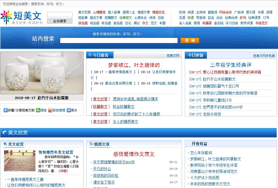 | 網(wǎng)站簡(jiǎn)介: 短美文(duanmeiwen.com),致力分享更多原創(chuàng)美文、經(jīng)典文章、情感日志、優(yōu)美散文和組成美文不可或小的好詞好句大全。 |