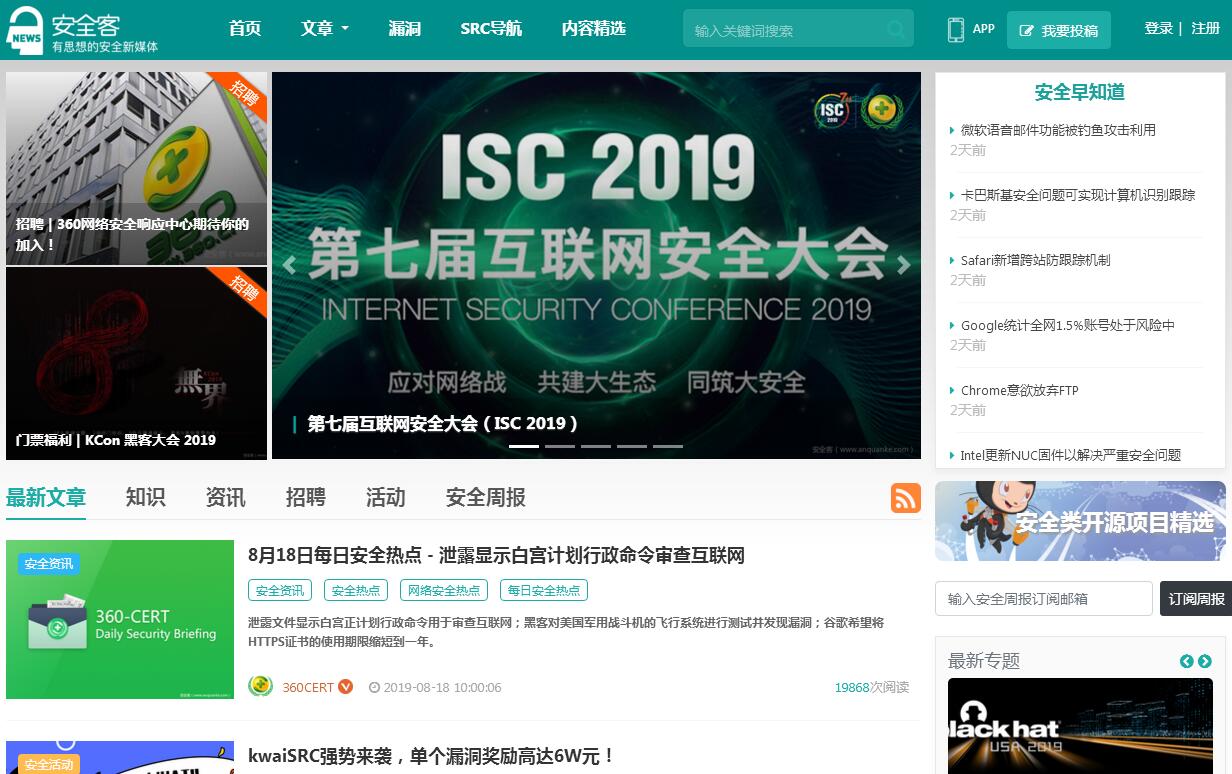 | 網(wǎng)站簡介: 安全客是一個為廣大安全愛好者和安全從業(yè)人員提供權(quán)威信息發(fā)布的漏洞信息、最新的安全資訊、最全的安全知識及精彩的安全活動的極具影響力的一站式安全平臺。 |