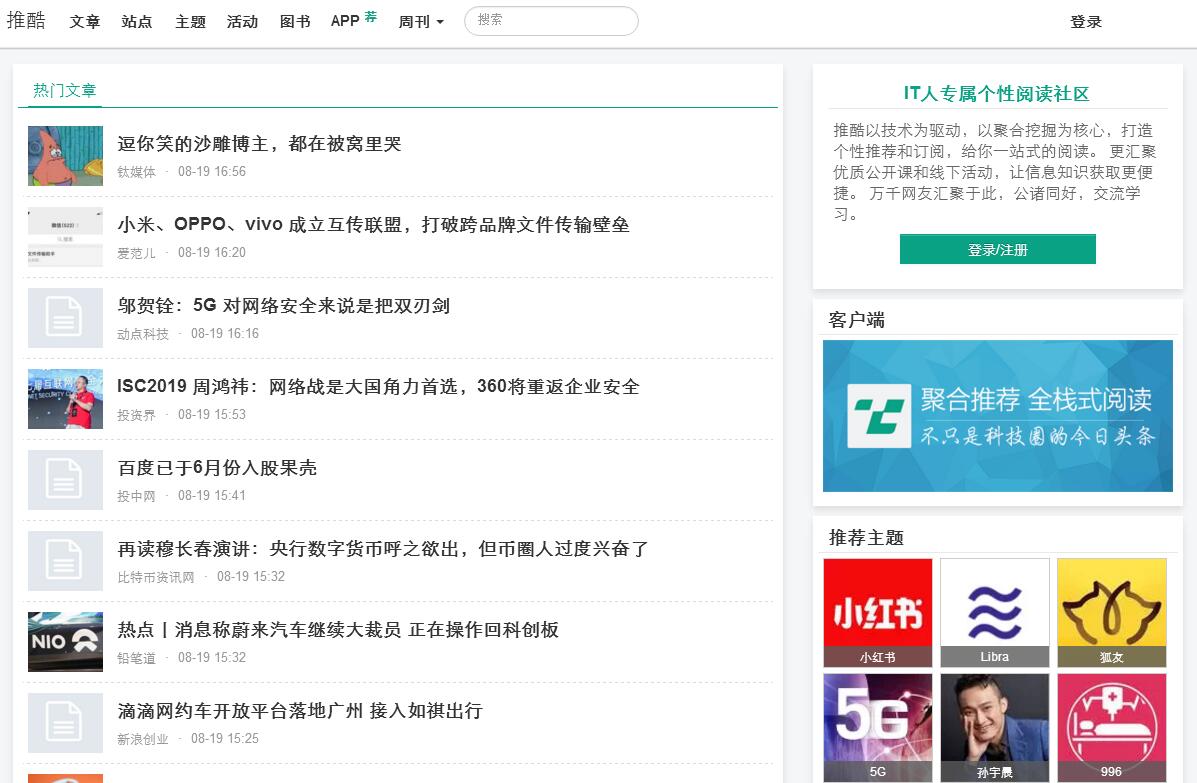 | 網(wǎng)站簡介: 推酷專注于IT領(lǐng)域的信息挖掘和聚合推薦,期望通過技術(shù)解決信息獲取方面的諸多問題。 更長遠(yuǎn)地,推酷期望能成為IT知識整合社區(qū),給你一站式閱讀、學(xué)習(xí)、交流的平臺。目前主推的產(chǎn)品有:1)個(gè)性化文章聚合推薦,提供的內(nèi)容涵蓋科技、技術(shù)、設(shè)計(jì)、營銷等方面。我們沒有小編,聚合和推薦的內(nèi)容完全依賴于分分鐘不停歇的推薦系統(tǒng)。2)IT類的線下線上活動聚合推薦,目前收錄的活動應(yīng)該是國內(nèi)最豐富的,但活動頻道還有很長的路要走。除了網(wǎng)站,我們還提供優(yōu)質(zhì)的安卓和iOS客戶端方便你的閱讀。 |