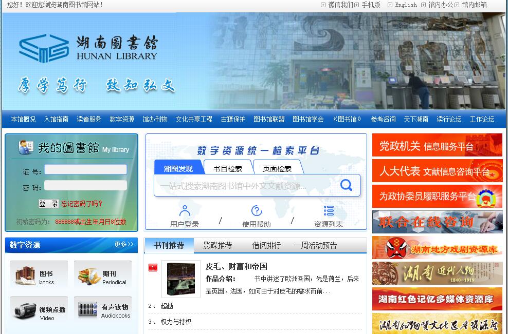 湖南圖書館是國家舉辦的省級綜合性公共圖書館,其前身是始建于1904年3月,由梁煥奎等人募捐、湖南巡撫趙爾巽準(zhǔn)令于古定王臺創(chuàng)辦的湖南圖書館兼教育博物館,它是我國第一家以“圖書館”命名的省級公共圖書館。1912年秋至1913年春毛澤東在此自學(xué)半年,1927年間何叔衡擔(dān)任館長。1949年后,特別是黨的十一屆三中全會后,湖南圖書館獲得了較快的發(fā)展。1984年12月韶山路湖南圖書館館舍落成開放,時任中共中央總書記的胡耀邦題寫了館名?,F(xiàn)有館舍主樓面積2.3萬平方米,培訓(xùn)樓6700余平方米,館藏實體文獻(xiàn)450余萬冊(件),其中圖書308余萬冊(件),古籍線裝書80余萬冊(件),報刊55余萬冊(件),視聽與縮微制品20余萬件。數(shù)字資源規(guī)模增速迅猛,電子圖書達(dá)330萬余種。年到館讀者256余萬人次,外借文獻(xiàn)259萬冊,網(wǎng)站年訪問量達(dá)2860余萬次。湖南圖書館是全國古籍重點(diǎn)保護(hù)單位,館藏中不少是稀世的善本、譜、牒、字畫、手札等,尤以豐富的地方文獻(xiàn)著稱。本館設(shè)有綜合借閱處、文學(xué)藝術(shù)圖書借閱室、中文報紙期刊借閱室、外文借閱室、中文參考圖書借閱室、地方文獻(xiàn)閱覽室、古籍閱覽室、電子閱覽室等服務(wù)窗口,還相繼設(shè)立了獨(dú)具特色的湖南人物資料中心、毛澤東著作版本室、徐特立藏書閱覽室、家譜收藏中心、滋賀文庫、音像借閱室、盲人圖書館、湖南圖書館少年兒童分館、老年圖書館、女子圖書館等。本館實行開架借閱,現(xiàn)設(shè)有閱覽座位1570余個,開展書刊外借、閱覽、參考咨詢、文獻(xiàn)檢索、專題服務(wù)、系列講座、社會教育等多種形式、多種途徑的讀者服務(wù)工作,成為廣大讀者喜愛的獲取知識信息、閱讀休閑的理想場所。近年來湖南圖書館加強(qiáng)信息化、網(wǎng)絡(luò)化基礎(chǔ)設(shè)施建設(shè),開辟了網(wǎng)址為www.library.hn.cn的湖南圖書館網(wǎng)站、網(wǎng)址為www.txhn.net的天下湖南網(wǎng)和湖南圖書館官方微信服務(wù)號,提供數(shù)字化、網(wǎng)絡(luò)化的電子資源服務(wù)。由我館承辦的共享工程湖南省分中心已成為我省開展文化信息資源共建共享的網(wǎng)絡(luò)中心、資源建設(shè)中心和信息服務(wù)中心。湖南圖書館堅持為社會主義服務(wù),為人民服務(wù)的方向,遵奉“讀者至上、服務(wù)第一”的原則,以“厚學(xué)篤行,致知弘文”為館訓(xùn),努力為社會主義精神文明、政治文明和物質(zhì)文明建設(shè)服務(wù),榮獲全國文化系統(tǒng)先進(jìn)集體并多次獲得全國文明圖書館、一級圖書館等榮譽(yù)稱號。