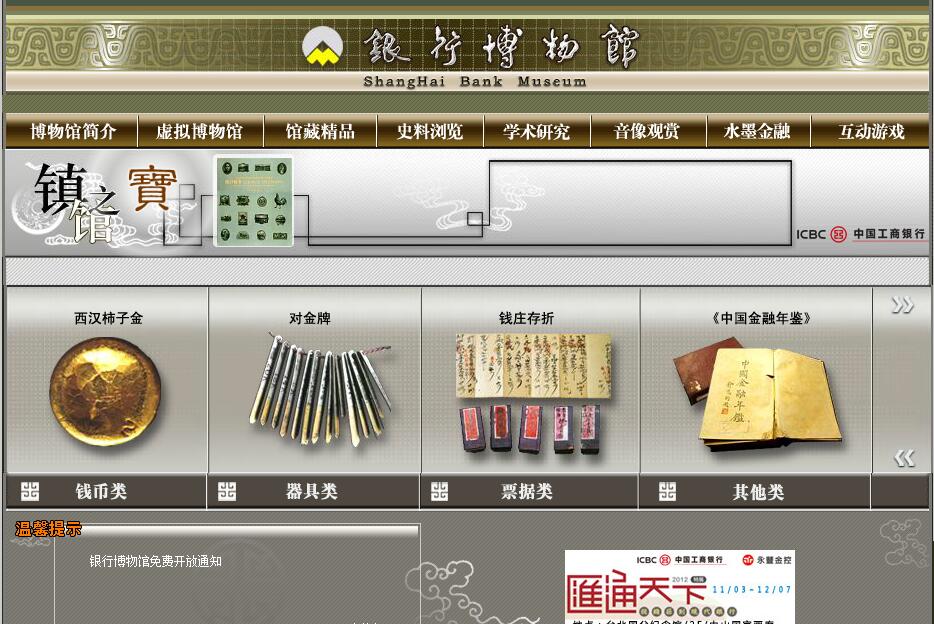 由中國工商銀行上海市分行主辦、上海市民政局登記注冊的上海市銀行博物館于1998年6月開始籌備;經(jīng)近二年籌建,于 2000年 4月 9日正式開館,時任中國工商銀行行長姜建清、上海市委副書記龔學(xué)平為銀行博物館揭牌。上海市銀行博物館是上海乃至全國首家金融行業(yè)博物館,它以其簡明、翔實的史料實物及生動、鮮明的表現(xiàn)手段,以上海近代銀行發(fā)展史為主線,濃縮了上海150年的銀行滄桑。上海市銀行博物館展廳面積1500平方米。博物館包括歷史館、錢幣館和展示廳,收集銀行各類藏品計20,000余件,陳列展品計2,000余件。其中較有歷史價值的有錢莊存折、帳冊、匯票,各個時期的銀行印章、支票、股票、徽章、器具、早期銀行使用的試金石、對金牌、天秤等,還有較為珍貴的兩千多年前戰(zhàn)國楚國“郢爰”、西漢時期的“金餅”、王莽時期的“金錯刀”、至元寶鈔、革命根據(jù)地紙幣、中國人民銀行發(fā)行的第一套人民幣等。銀行博物館還設(shè)“清末民初錢莊”、“兌換銀元”、“80年代初人民銀行儲蓄所”四個場景,采用高分子材料制成的人物雕塑栩栩如生。為生動體現(xiàn)改革、開放以來上海銀行業(yè)蓬勃發(fā)展面貌,在2000年底,又增添了上海外灘和浦東陸家嘴金融貿(mào)易區(qū)建筑模型,采取光、聲控現(xiàn)代科技手段,展現(xiàn)上海銀行業(yè)在改革、開放中日新月異的巨大變化。上海市銀行博物館自開館以來,參觀者絡(luò)繹不絕。受到社會各界的關(guān)注與好評。上海電視大學(xué)、上海高等金融專科學(xué)校等大專院校要求將銀行博物館作為他們學(xué)生的第二課堂,要使每一個學(xué)生都要到這里來上一課。來自上海財經(jīng)大學(xué)研究生部、復(fù)旦大學(xué)經(jīng)濟(jì)學(xué)院、華東師范大學(xué)商學(xué)院和中歐國際工商學(xué)院的學(xué)生,參觀后都感到大飽眼福。對上海百年金融歷史有了更為深刻的了解,紛紛表示要努力學(xué)習(xí),今后有志于中國金融事業(yè)。銀行博物館在海外及港澳地區(qū)也產(chǎn)生了一定的影響。2000年在上海舉行的亞太地區(qū)儲協(xié)年會與會代表、2001年APEC會議代表、2002年亞洲開發(fā)銀行年會代表、香港銀行公會訪問團(tuán)、全市外資銀行百余名行長都慕名前來參觀。外國友人熱情洋溢留言:“這是一個非常有趣、非常美妙的博物館”、“我們看到了中國金融的過去,更看到了中國金融的美好未來!”上海市銀行博物館不僅成為工商銀行企業(yè)形象的一個重要窗口,也成為上海金融文化的一個亮點。