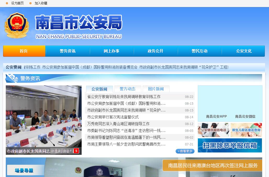 南昌市公安局為南昌市人民政府主管全市公安工作的組成部門。其主要職責是:(一)貫徹執(zhí)行國家的法律、法規(guī)和公安工作的路線、方針、政策;研究擬訂全市公安工作的規(guī)定和實施辦法;對全市公安機關(guān)實施組織領(lǐng)導(dǎo)和指揮;負責對全市公安工作的部署、指導(dǎo)、監(jiān)督和檢查。(二)掌握影響社會穩(wěn)定、危害國內(nèi)安全和社會治安的情況,分析形勢,制定對策。(三)組織實施并指導(dǎo)全市公安機關(guān)偵查工作,組織、協(xié)調(diào)處置重大案件、治安事件、治安事故和重大群體性事件、騷亂。(四)組織實施并指導(dǎo)全市公安機關(guān)依法查處危害社會治安秩序行為;依法管理戶籍和門樓牌、流動人口、居民身份證、危險物品和特種行業(yè)等工作。(五)指導(dǎo)、監(jiān)督全市公安機關(guān)對國家機關(guān)、社會團體、企事業(yè)單位和重點建設(shè)工程的治安保衛(wèi)工作以及群眾性治安組織的治安防范工作;指導(dǎo)機關(guān)、團體、企事業(yè)單位保衛(wèi)組織和經(jīng)濟民警、保安隊伍的建設(shè)。(六)組織指導(dǎo)出入境和外國人在我市境內(nèi)居留、旅行的有關(guān)管理工作,組織指導(dǎo)全市公安外事工作。(七)組織實施并指導(dǎo)、監(jiān)督全市消防和警衛(wèi)工作;對武警部隊執(zhí)行公安任務(wù)及相關(guān)業(yè)務(wù)建設(shè)實施領(lǐng)導(dǎo)和指揮。(八)組織實施并指導(dǎo)全市公安機關(guān)維護道路交通安全、交通秩序以及機動車輛、駕駛?cè)斯芾砉ぷ鳌?九)組織實施并指導(dǎo)、監(jiān)督全市公共信息網(wǎng)絡(luò)的安全監(jiān)察工作。(十)指導(dǎo)、監(jiān)督全市公安機關(guān)依法承擔的執(zhí)行刑罰工作,組織實施并指導(dǎo)、監(jiān)督全市看守所、治安拘留所、強制隔離戒毒所等的管理工作,規(guī)劃和指導(dǎo)全市監(jiān)所建設(shè)。(十一)組織實施并指導(dǎo)全市公安法制建設(shè);指導(dǎo)、檢查、監(jiān)督全市公安機關(guān)執(zhí)法活動。(十二)組織實施并指導(dǎo)全市公安機關(guān)開展禁毒和緝毒工作,承擔市禁毒委員會辦公室的日常工作。(十三)組織協(xié)調(diào)處置恐怖事件、突發(fā)性群體事件和重大安全事故,以及承辦市反恐怖協(xié)調(diào)領(lǐng)導(dǎo)小組辦公室和市處置突發(fā)性事件領(lǐng)導(dǎo)小組辦公室的日常工作。(十四)組織實施全市公安科學技術(shù)工作,規(guī)劃全市公安指揮系統(tǒng)、信息技術(shù)、刑事技術(shù)和技術(shù)偵察建設(shè)。(十五)擬定并組織落實全市公安機關(guān)裝備、被裝配備和經(jīng)費等警務(wù)保障標準、制度。(十六)指導(dǎo)全市公安政治工作和隊伍建設(shè);組織實施并指導(dǎo)、管理全市公安宣傳、教育、訓練工作;按規(guī)定權(quán)限管理干部人事工作。(十七)制定全市公安隊伍監(jiān)督管理工作規(guī)章制度、分析隊伍狀況;組織實施并指導(dǎo)全市公安機關(guān)督察工作,按規(guī)定權(quán)限實施對干部的監(jiān)督,查處或督辦公安隊伍重大和較大違紀案件;指導(dǎo)全市公安隊伍思想作風、工作作風建設(shè)。(十八)承辦市人民政府交辦的其他事項。
