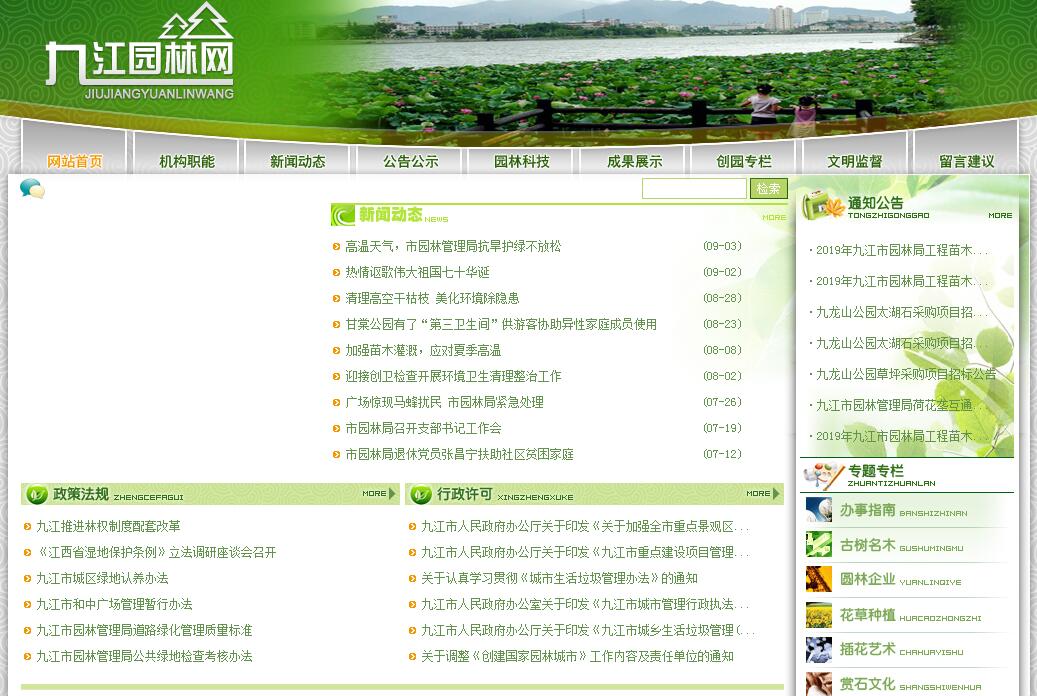 九江市園林管理局,為市建設(shè)規(guī)劃局副處級(jí)下屬事業(yè)單位。其主要職責(zé)是:(一)貫徹執(zhí)行國(guó)家和省有關(guān)城市綠化工作的方針、政策和法律、法規(guī);擬定園林綠化管理辦法并組織實(shí)施。(二)根據(jù)城區(qū)總體規(guī)劃,組織編制綠地系統(tǒng)詳細(xì)規(guī)劃和城市綠化專業(yè)規(guī)劃,確定城區(qū)各地段和各種性質(zhì)用地的綠地率、人均公共綠地面積控制指標(biāo),組織實(shí)施城區(qū)綠化規(guī)劃,編制并實(shí)施城區(qū)綠化中長(zhǎng)期發(fā)展規(guī)劃和年度計(jì)劃;參與城市綠地范圍控制線(綠線)的劃定工作,負(fù)責(zé)對(duì)綠線依法進(jìn)行管理。(三)負(fù)責(zé)城區(qū)公共綠地、生產(chǎn)綠地、風(fēng)景林地、行道樹、干道綠化帶及園林設(shè)施的規(guī)劃、建設(shè)、養(yǎng)護(hù)、管理;監(jiān)督、檢查、指導(dǎo)城區(qū)市屬、駐市各單位管界內(nèi)的單位附屬綠地,單位、私營(yíng)自建公園、居住區(qū)綠地的綠化規(guī)劃、建設(shè)和管理工作。(四)依法審批城區(qū)公共綠地、專用綠地、風(fēng)景林地和干道綠化帶等綠化工程方案;依法審批城區(qū)新、改、擴(kuò)建工程建設(shè)項(xiàng)目的附屬綠化工程設(shè)計(jì)方案,參與建設(shè)規(guī)劃行政主管部門對(duì)城區(qū)新建、改建、擴(kuò)建工程項(xiàng)目建設(shè)方案的會(huì)審;負(fù)責(zé)城區(qū)新建、改建、擴(kuò)建工程建設(shè)項(xiàng)目附屬綠化工程的方案審批和竣工驗(yàn)收,負(fù)責(zé)城市規(guī)劃區(qū)內(nèi)居住小區(qū)、單位庭院附屬綠化工程的方案審批和竣工驗(yàn)收;制定綠化建設(shè)工程質(zhì)量地方標(biāo)準(zhǔn)和綠化工程定額標(biāo)準(zhǔn)。(五)負(fù)責(zé)城區(qū)因建設(shè)需要樹木移植、砍伐和綠地臨時(shí)占用的勘察和初審,前置條件完備的,向上級(jí)主管部門申報(bào)。(六)負(fù)責(zé)城區(qū)古樹名木的鑒定、調(diào)查、統(tǒng)計(jì)、建檔及對(duì)古樹名木養(yǎng)護(hù)的監(jiān)督、指導(dǎo),救護(hù)及繁殖瀕危植物和做好城區(qū)野生動(dòng)物的救助工作。(七)做好園林綠化行業(yè)職工培訓(xùn)、繼續(xù)教育和人才開發(fā)、園林綠化科學(xué)研究、科技成果推廣應(yīng)用和新技術(shù)引進(jìn)工作。(八)負(fù)責(zé)城區(qū)園林綠化、動(dòng)物科普教育宣傳工作,負(fù)責(zé)本局綠化統(tǒng)計(jì)、成果普查、資源調(diào)查評(píng)估和檔案管理工作。(九)負(fù)責(zé)12319市民熱線求助的處理工作。(十)完成上級(jí)交辦的其他工作。