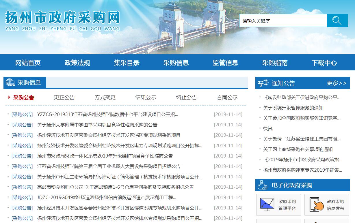 揚(yáng)州市政府采購(gòu)中心成立于一九九九年六月,是揚(yáng)州市人民政府設(shè)立的專門從事本級(jí)政府采購(gòu)事務(wù)的非營(yíng)利性事業(yè)單位。日常工作以《政府采購(gòu)法》和相關(guān)的法律、法規(guī)為依據(jù),本著公開透明、公平競(jìng)爭(zhēng)、公正和誠(chéng)實(shí)信用的原則,按照采購(gòu)價(jià)格低于市場(chǎng)平均價(jià)格,采購(gòu)效率更高,采購(gòu)質(zhì)量?jī)?yōu)良和服務(wù)良好的要求,通過公開招標(biāo)等采購(gòu)形式統(tǒng)一組織市級(jí)國(guó)家機(jī)關(guān)、事業(yè)單位和團(tuán)體組織納入政府集中采購(gòu)目錄以內(nèi)的或者采購(gòu)限額以上的貨物、工程和服務(wù)類政府項(xiàng)目的采購(gòu)。主要職責(zé):1、根據(jù)核準(zhǔn)的政府采購(gòu)預(yù)算和計(jì)劃,受采購(gòu)人委托,制定集中采購(gòu)的具體操作方案并組織實(shí)施。2、直接組織各種招標(biāo)活動(dòng)。3、采購(gòu)人委托的權(quán)限簽訂或組織簽訂采購(gòu)合同,并督促合同履行。4、制定采購(gòu)中心內(nèi)部操作規(guī)程。5、受采購(gòu)人委托,代理集中采購(gòu)目錄以外的分散采購(gòu)。6、 建立健全專家、供應(yīng)商、商品和服務(wù)的信息庫(kù)。