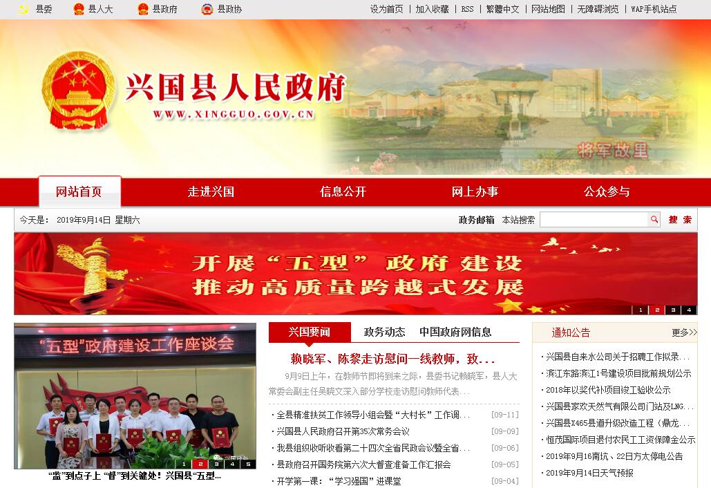 興國,位于江西省中南部,贛州市北部,東倚寧都,東南鄰于都,南連贛縣,西鄰萬安,西北界泰和,北毗吉安市青原區(qū)、永豐,連接吉泰盆地,距贛州市82公里、省會(huì)南昌346公里。全縣轄25個(gè)鄉(xiāng)鎮(zhèn)、1個(gè)經(jīng)濟(jì)開發(fā)區(qū)、304個(gè)行政村、8個(gè)城市社區(qū),全縣國土總面積3215平方公里,總?cè)丝?5萬?!?dú)v史悠久,人杰地靈。興國建縣于三國,至今已有近1800年的歷史。著名人物古有唐代“江南第一宰相”鐘紹京,宋代理學(xué)詩文家李潛、李卿、李仆父子兄弟七進(jìn)士,明代史學(xué)家呂復(fù),欽天監(jiān)靈臺(tái)博士廖均卿,清雍正重臣禮部侍郎王思軾,近有美國決策科學(xué)會(huì)議主席、泛美大學(xué)教授李電白博士,美國加州州立科技綜合大學(xué)終身教授范新亞以及著名史學(xué)家、目錄學(xué)家姚名達(dá)等。——蘇區(qū)模范,紅色故土。興國是全國著名的蘇區(qū)模范縣、紅軍縣、烈士縣和譽(yù)滿中華的將軍縣。毛澤東、朱德、周恩來、陳毅等老一輩無產(chǎn)階級(jí)革命家都曾在這里工作和戰(zhàn)斗過。蘇區(qū)時(shí)期,全縣23萬人口,參軍參戰(zhàn)的就達(dá)9.3萬余人,為國捐軀的達(dá)5萬多人,全縣姓名可考的烈士達(dá)23179名,長征路上幾乎每一公里就有一名興國籍將士倒下。在血與火的考驗(yàn)中,孕育了肖華、陳奇涵等56位共和國開國將軍。毛澤東同志曾稱贊興國人民創(chuàng)造了“第一等工作”,并親筆書寫了“模范興國”的獎(jiǎng)旗授予興國。——山川秀麗,風(fēng)情獨(dú)特。境內(nèi)紅、綠、古等各色景點(diǎn)交相輝映,是旅游、休閑、觀光的好地方。紅色方面,擁有以“一院”(瀲江書院)、“二館”(將軍館和革命歷史館)、“六園”(作風(fēng)園、調(diào)查園、兵工園、名人園、烈士園、將軍園)、“七大革命舊址”(土地革命干部培訓(xùn)班舊址、中共江西省委舊址、江西省第一次工農(nóng)兵代表大會(huì)舊址、江西軍區(qū)舊址、長岡鄉(xiāng)調(diào)查舊址、中央兵工廠舊址、中國工農(nóng)紅軍總醫(yī)院暨紅軍軍醫(yī)學(xué)校舊址)為代表的紅色景點(diǎn)。綠色方面,冰心洞、太平巖、寶石仙境、丹霞湖和均福山森林公園等自然景觀神工造化,風(fēng)光秀麗,各領(lǐng)風(fēng)騷。古色方面,興國山歌聞名遐邇,被列入首批國家級(jí)非物質(zhì)文化遺產(chǎn)名錄,是文化部命名的“中國民間藝術(shù)山歌之鄉(xiāng)”、“中國民間文化藝術(shù)之鄉(xiāng)”;是中國風(fēng)水文化的發(fā)源地,梅窖三僚被海內(nèi)外盛稱為“中國風(fēng)水文化第一村”,被評(píng)為“全省十大特色景區(qū)”和“江西鄉(xiāng)村游十大美景”,世界各地的風(fēng)水愛好者每年都云集三僚開展文化研習(xí)活動(dòng),興國三僚風(fēng)水文化被列入省級(jí)非物質(zhì)文化遺產(chǎn)保護(hù)項(xiàng)目。——資源豐富,物產(chǎn)富饒。礦產(chǎn)資源方面,已探明儲(chǔ)量較大的有螢石、石灰石、高嶺土、金、鎢、鉬等20多種,是贛州氟化工基地;農(nóng)林資源方面,盛產(chǎn)臍橙、茶油、生豬、灰鵝等,是國家命名的“中國油茶之鄉(xiāng)”、“中國灰鵝之鄉(xiāng)”、“中國紅鯉魚之鄉(xiāng)”?!煌ū憬荩瑓^(qū)位優(yōu)越。興國縣位屬贛州市一小時(shí)城市經(jīng)濟(jì)圈,距贛州黃金機(jī)場、井岡山機(jī)場均1小時(shí)路程;可通過京九、浙贛鐵路與長江三角洲進(jìn)行經(jīng)濟(jì)聯(lián)系;緊鄰廣州黃埔港、深圳蛇口、汕頭港、廈門港等港口城市,路程均在550公里以內(nèi),且都有高速公路相連接;境內(nèi)有319國道和泉南高速公路經(jīng)過,泉南高速在興國段有三個(gè)互通口,距昆廈高速公路40公里;興贛高速建成通車,昌贛客專、興泉鐵路加速推進(jìn),興贛高速北延、瑞興于快速交通走廊開工建設(shè),“四縱四橫”①綜合交通網(wǎng)絡(luò)初步形成;隨著興國至井岡山紅色旅游高速公路的規(guī)劃建設(shè),交通將更加便捷?!鐣?huì)和諧,經(jīng)濟(jì)繁榮。近年來,在上級(jí)黨政的正確領(lǐng)導(dǎo)下,大力弘揚(yáng)蘇區(qū)模范光榮傳統(tǒng),與時(shí)俱進(jìn),開拓創(chuàng)新,實(shí)現(xiàn)了全縣經(jīng)濟(jì)社會(huì)各項(xiàng)事業(yè)的全面健康較快發(fā)展。