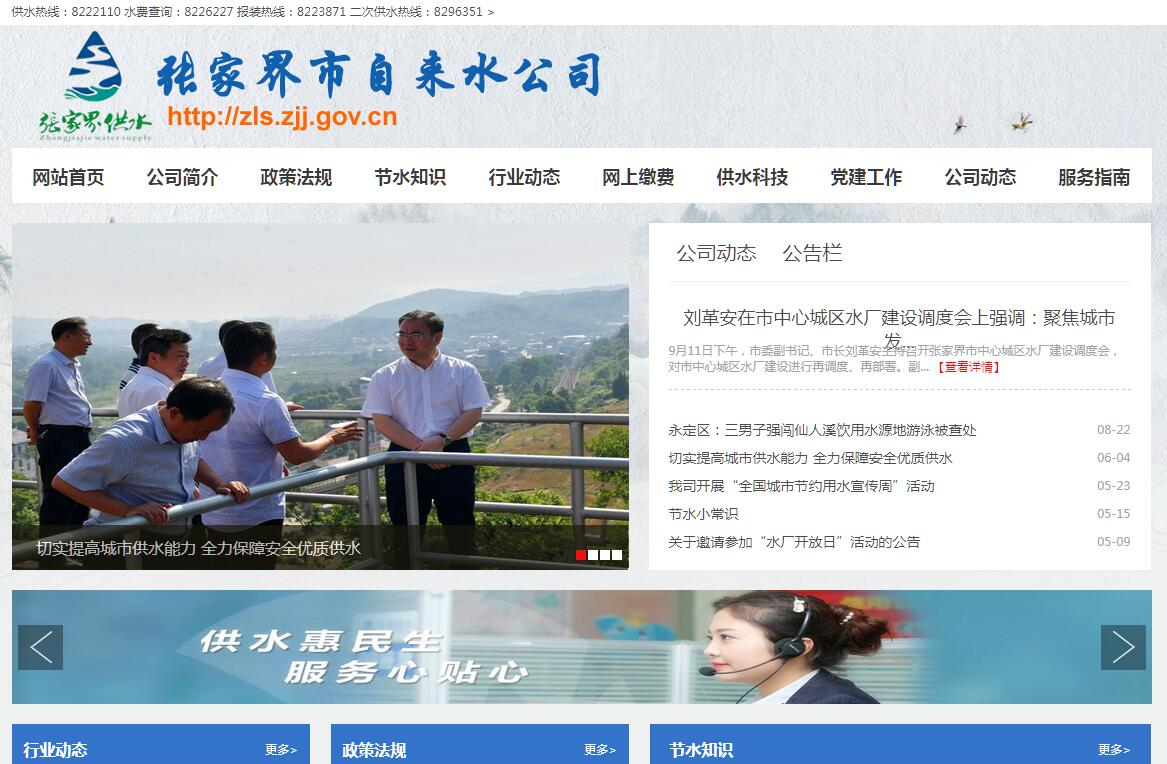 張家界市自來水公司隸屬市住建局,成立于1982年,是一家以自來水生產(chǎn)供應、市政工程安裝、二次供水服務為主的國有獨資供水企業(yè),服務人口近20萬人,服務面積24平方公里,供水人口約26萬人,總戶數(shù)95729戶,其中實現(xiàn)遠程智能抄表達46792戶,供水基本覆蓋整個中心城區(qū),供水普及率達96%,水質綜合合格率99.8%。;現(xiàn)下轄4個水廠,總供水能力17萬噸/日,擁有DN100以上供水管網(wǎng)總長242.01千米,在線壓力監(jiān)測點25個,二次供水加壓站78個,加壓設備111套,具備106項衛(wèi)生指標檢測能力。下轄兩個全資子公司:張家界祥宇市政工程有限責任公司和張家界科標水質檢測有限公司。目前公司總資產(chǎn)1.2億元,凈資產(chǎn)7395萬元,在職員工306人。作為國有公益企業(yè),公司始終秉承“安全、高效、優(yōu)質、文明”供水的理念,大力弘揚“精誠團結、求真務實、勇于創(chuàng)新”的企業(yè)精神,為市中心城區(qū)居民提供安全水、放心水、優(yōu)質水,為張家界市社會經(jīng)濟發(fā)展做出積極貢獻。近幾年公司多次獲得“湖南省文明行業(yè)”、“湖南省集中式供水衛(wèi)生管理先進單位”、“湖南省城市供水先進單位”、“市行業(yè)納稅狀元”和“市國資委先進基層黨組織”等榮譽稱號,涌現(xiàn)出了“全國五一勞動獎”省級勞模秦周武、市級勞模陳繼文、“全國優(yōu)秀工會積極分子”黃蘭等先進模范人物。