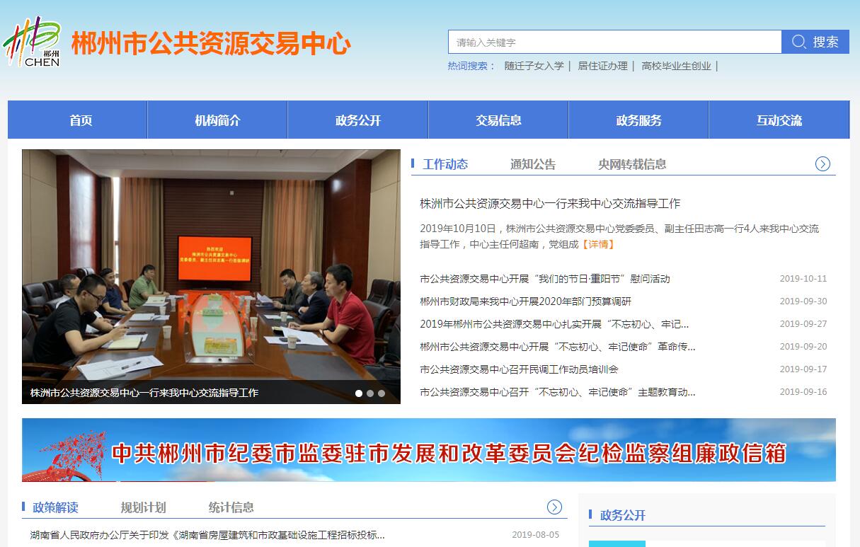 郴州市公共資源交易中心是市人民政府直屬工作部門,屬正處級公益二類事業(yè)單位,負責全市公共資源交易服務工作,主要職責為:貫徹執(zhí)行國家、省有關公共資源交易活動的法律法規(guī)和方針政策;負責全市公共資源交易平臺及信息網(wǎng)絡系統(tǒng)建設、運行、管理;依法依規(guī)為進入公共資源交易平臺的各類公共資源交易活動提供場所、設施和服務;組織平臺內交易活動,維護交易現(xiàn)場秩序;在相關行政部門監(jiān)督下,承擔評標專家抽取有關工作等。中心內設綜合科、財務科、技術信息科、監(jiān)督服務科、工程建設交易科、政府采購交易科、資源交易科和產權交易科等8個科室。位于郴州市市民服務中心三、四樓,面積約8000平方米,按功能分為辦公區(qū)、評標區(qū)、開標區(qū)、業(yè)務受理區(qū)和監(jiān)督服務區(qū)等區(qū)域。中心將圍繞“創(chuàng)建一流平臺”的工作目標,努力踐行“為民、務實、清廉、高效”的服務承諾,不斷加強自身建設,切實提升公共服務水平,竭力打造公開、公平、公正、誠信的公共資源交易平臺,營造便民、利民、惠民的服務環(huán)境,為加快建設“五個郴州”貢獻力量!