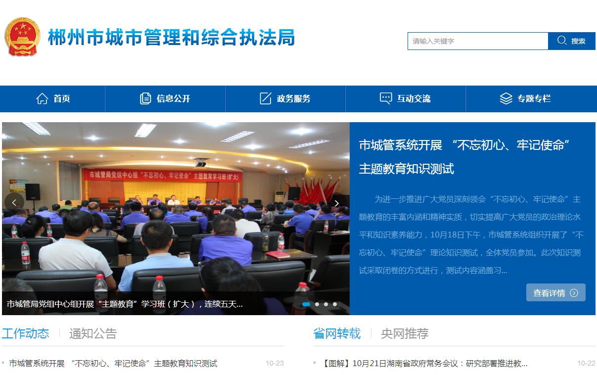 | 網(wǎng)站簡介: 郴州市城市管理和綜合執(zhí)法局,是郴州市機(jī)構(gòu)改革組建的新部門,為郴州市人民政府工作部門。 |