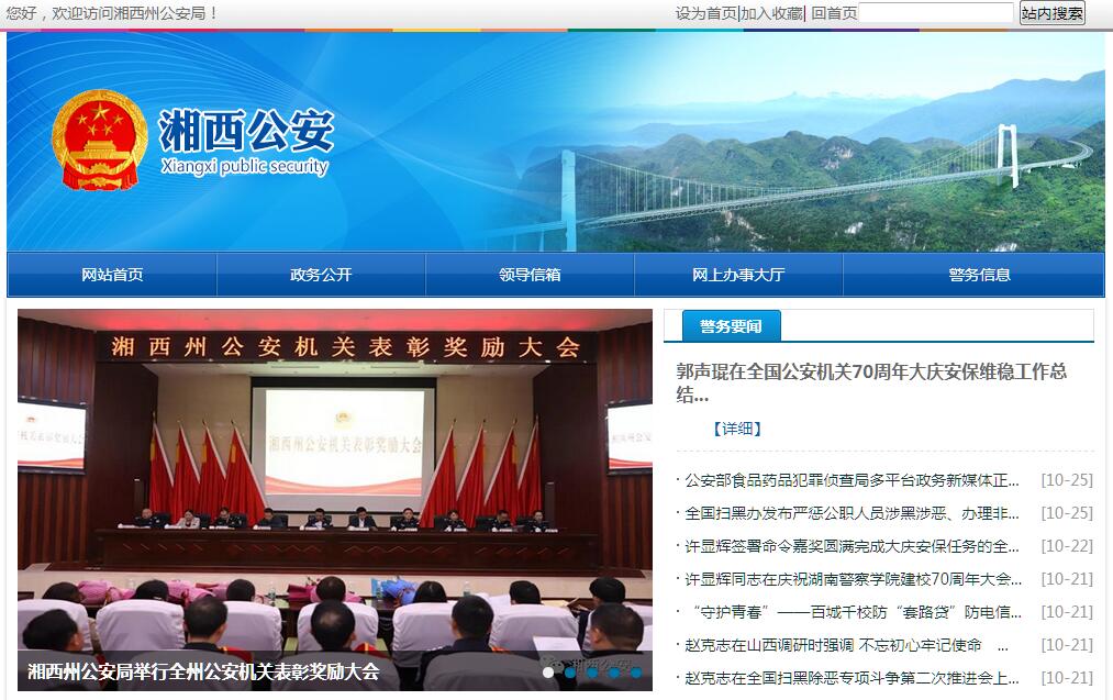 湘西自治州公安局是湘西州人民政府組成部門,主要擔(dān)負(fù)以下工作職能:(一)貫徹執(zhí)行國(guó)家有關(guān)公安工作的方針、政策和法律、法規(guī),組織、指導(dǎo)、監(jiān)督、檢查全州公安工作。(二)掌握影響穩(wěn)定、危害國(guó)內(nèi)安全和社會(huì)治安的情況,分析形勢(shì),制定對(duì)策。(三)組織、指導(dǎo)案件的偵查工作及重大案件(事件)、治安事故和騷亂的處理。(四)指導(dǎo)、監(jiān)督全州公安機(jī)關(guān)依法查處危害社會(huì)治安秩序的行為;依法管理危險(xiǎn)物品和公共場(chǎng)所等工作:(五)依法管理國(guó)籍、出境入境和外國(guó)人在州居留、旅行的有關(guān)管理工作;負(fù)責(zé)涉外案件的查處。(六)指導(dǎo)、監(jiān)督全州消防工作。(七)組織、指導(dǎo)、監(jiān)督全州公安機(jī)關(guān)維護(hù)道路交通安全、交通秩序以及機(jī)動(dòng)車輛、駕駛員管理工作;指導(dǎo)、參與重大交通事故的查處。(八)組織指導(dǎo)、監(jiān)督全州公安機(jī)關(guān)對(duì)國(guó)家機(jī)關(guān)、社會(huì)團(tuán)體、企事業(yè)單位和重點(diǎn)建設(shè)工程的治安保衛(wèi)工作以及群眾性治安保衛(wèi)組織的治安防范工作。(九)依法開展對(duì)全州公共信息網(wǎng)絡(luò)的安全監(jiān)察工作。(十)指導(dǎo)、監(jiān)督全州公安機(jī)關(guān)依法承擔(dān)的執(zhí)行刑罰和監(jiān)督、考察工作;指導(dǎo)、監(jiān)督全州公安機(jī)關(guān)對(duì)看守所的管理工作,承擔(dān)全州吸毒人員的強(qiáng)制戒毒任務(wù)。(十一)受理行政案件復(fù)議和應(yīng)訴。(十二)組織實(shí)施對(duì)來(lái)我州黨和國(guó)家領(lǐng)導(dǎo)人以及重要外賓、重要會(huì)議的安全警衛(wèi)工作。(十三)組織、指導(dǎo)、監(jiān)督全州公安機(jī)關(guān)開展禁毒、緝毒工作;承擔(dān)州禁毒委員會(huì)辦公室的日常工作。(十四)組織實(shí)施全州公安科學(xué)技術(shù)工作;規(guī)劃全州公安信息技術(shù)、刑事技術(shù)和行動(dòng)技術(shù)等建設(shè)。(十五)組織指導(dǎo)全州公安機(jī)關(guān)裝備、被裝配備的計(jì)劃、申報(bào)、分配、管理工作。(十六)指導(dǎo)、監(jiān)督消防建設(shè)。(十七)指導(dǎo)全州公安隊(duì)伍建設(shè);指導(dǎo)和管理公安機(jī)關(guān)人員培訓(xùn)、教育、獎(jiǎng)懲、優(yōu)撫及公安宣傳工作,檢查、監(jiān)督落實(shí)情況;負(fù)責(zé)公安民警的警銜管理;按規(guī)定權(quán)限管理干部。(十八)制訂全州公安隊(duì)伍監(jiān)督管理工作規(guī)章制度,組織、指導(dǎo)全州公安機(jī)關(guān)督察工作;按規(guī)定權(quán)限實(shí)施對(duì)干部的監(jiān)督;指導(dǎo)、督促、檢查全州公安機(jī)關(guān)的執(zhí)法活動(dòng);查處或督辦公安隊(duì)伍重大違紀(jì)案件。(十九)承辦州委、州人民政府和省公安廳交辦的其他事項(xiàng)。