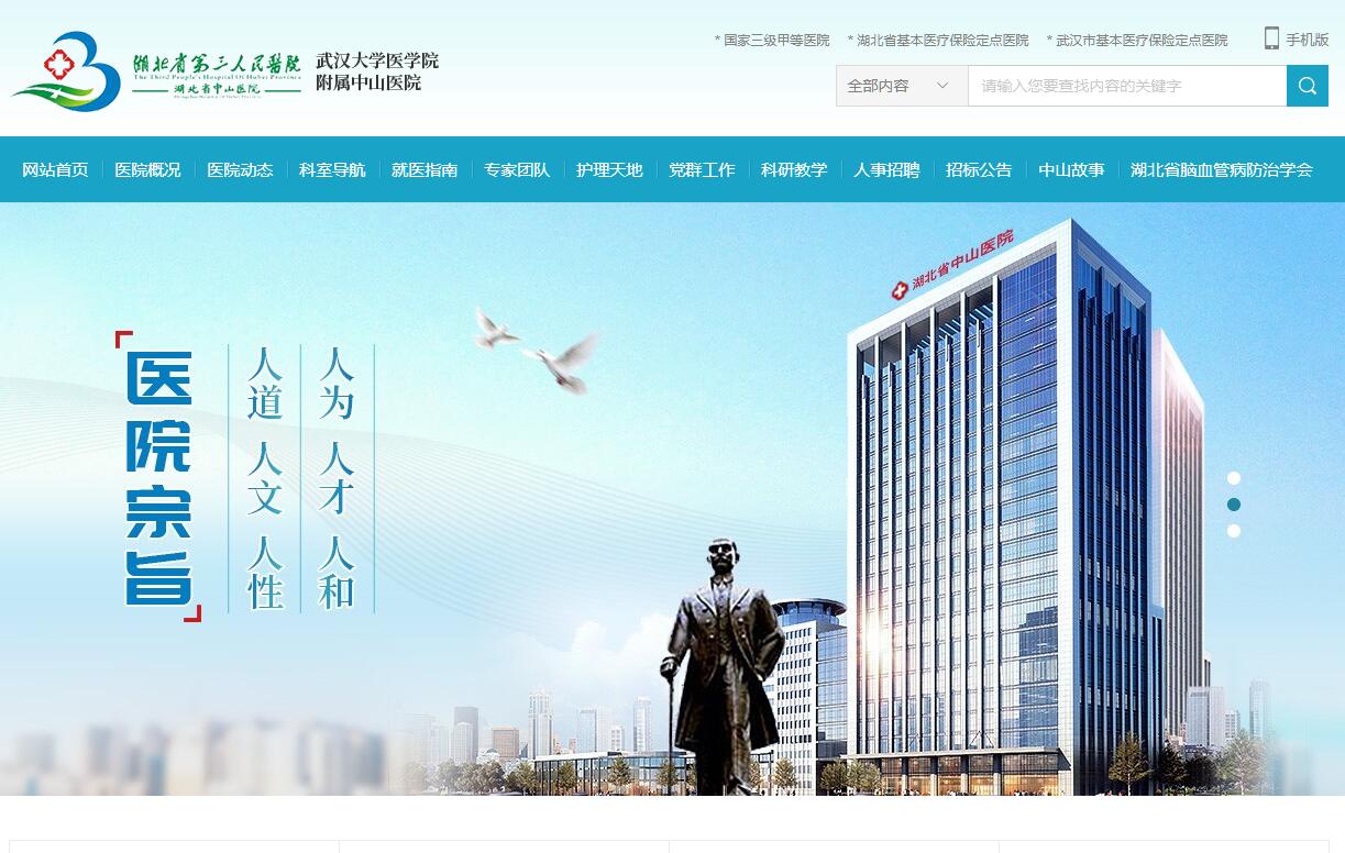 湖北省第三人民醫(yī)院(湖北省中山醫(yī)院)始建于1951年,原名武漢軍工總醫(yī)院。2002年6月,由軍隊(duì)管理移交至湖北省衛(wèi)生廳,更名為湖北省中山醫(yī)院。2014年12月,省衛(wèi)生計(jì)生委批準(zhǔn)醫(yī)院第一名稱變更為湖北省第三人民醫(yī)院。醫(yī)院是政府主辦的全民非營利性醫(yī)療機(jī)構(gòu),同屬“武漢大學(xué)醫(yī)學(xué)院附屬中山醫(yī)院”,是一所集醫(yī)療、科研、教學(xué)、預(yù)防、康復(fù)為一體的綜合性大型三級甲等醫(yī)院,是醫(yī)保和商業(yè)保險(xiǎn)定點(diǎn)醫(yī)院、湖北省康復(fù)救助項(xiàng)目定點(diǎn)機(jī)構(gòu)、國家愛嬰醫(yī)院。2004年9月,偉大的革命先行者孫中山先生的孫女,檀香山中國婦女慈善會(huì)會(huì)長孫穗芳博士受聘擔(dān)任醫(yī)院名譽(yù)院長。醫(yī)院設(shè)有硚口和陽邏兩個(gè)院區(qū),編制床位1800張,職工1900余人,是“湖北省基層衛(wèi)生指導(dǎo)與培訓(xùn)中心”、“湖北省腦卒中診療中心”、“湖北省腦卒中篩查與防治領(lǐng)導(dǎo)小組辦公室”、“湖北省疼痛醫(yī)療質(zhì)量控制中心”掛靠單位,湖北省互聯(lián)網(wǎng)醫(yī)院。同時(shí)也是首批“國家住院醫(yī)師規(guī)范化培訓(xùn)基地”、國家三級甲等醫(yī)院,是“國家藥品臨床試驗(yàn)(GCP)基地”、“國家級高級卒中中心”、“衛(wèi)生部腦卒中篩查與防控基地”、“全國肝膽病防治技術(shù)示范基地”、“國家級皮膚醫(yī)療美容示范基地”、“全國健康管理示范基地”、“湖北省腦卒中篩查與防治基地”、“湖北省疼痛治療中心”、“武漢市腦癱兒童康復(fù)技術(shù)指導(dǎo)中心”,湖北省疼痛學(xué)會(huì)主任委員單位,湖北省肝膽疾病學(xué)會(huì)中西醫(yī)結(jié)合肝膽病專委會(huì)主任委員單位,湖北省殘疾人康復(fù)協(xié)會(huì)肢體殘疾康復(fù)委員會(huì)腦癱康復(fù)組主任委員單位。神經(jīng)內(nèi)科、疼痛科、醫(yī)學(xué)美容科和超聲影像科是湖北省臨床重點(diǎn)???。