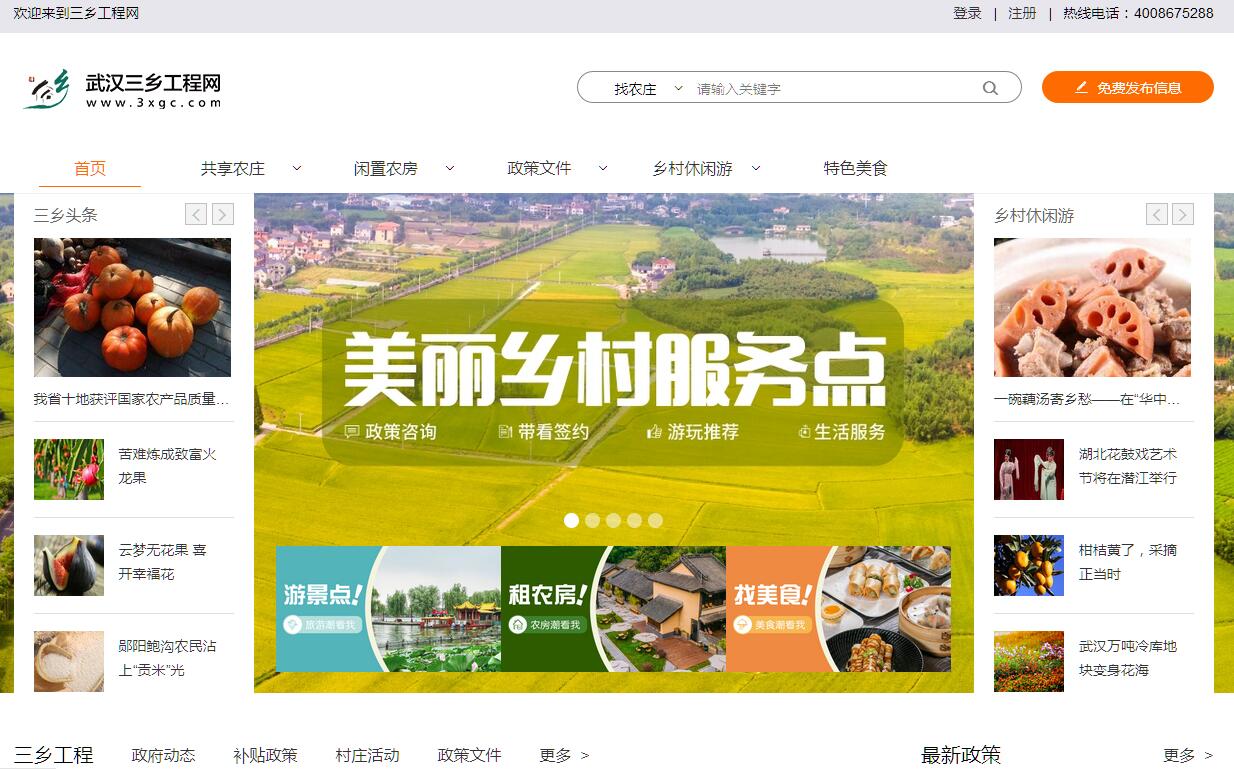 | 網(wǎng)站簡(jiǎn)介: 武漢三鄉(xiāng)工程網(wǎng)是由武漢市政府搭建的鄉(xiāng)村振興平臺(tái)。提供武漢2萬(wàn)多套閑置農(nóng)房出租、鄉(xiāng)村康養(yǎng)、鄉(xiāng)村別墅出租。提供農(nóng)莊、鄉(xiāng)村民宿、農(nóng)家樂餐飲、住宿和景點(diǎn)門票預(yù)訂、消費(fèi)優(yōu)惠等鄉(xiāng)村休閑旅游信息。 |