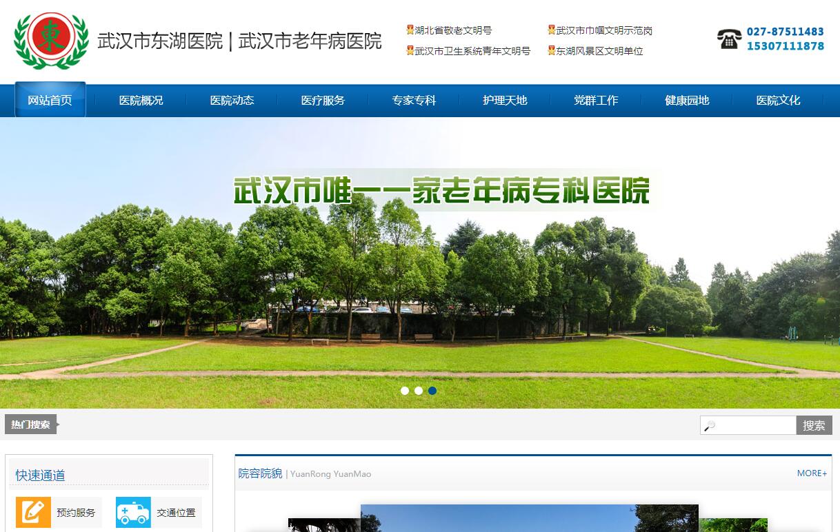 武漢市東湖醫(yī)院(武漢市老年病醫(yī)院)前身為1910年由俄、法、德、英四國工部局聯(lián)合組建的"萬國醫(yī)院",1950年由武漢市人民政府接管,成立武漢市第一家干部療養(yǎng)院。1973年更名為"武漢市東湖醫(yī)院",成為以收治老年疾病為主的綜合性醫(yī)療機構(gòu)。1999年10月經(jīng)武漢市編制委員會批準,掛牌為"武漢市老年病醫(yī)院"。經(jīng)過一個多世紀的建設(shè),醫(yī)院已發(fā)展成為一所集預防、醫(yī)療、保健、康復、體檢、健康管理于一體的武漢市公立老年病??漆t(yī)院,是湖北省、武漢市老干部定點醫(yī)院、武漢市首批醫(yī)保定點醫(yī)療單位、湖北省針灸推拿康復??坡?lián)盟理事單位、武漢市城市圈中醫(yī)聯(lián)盟成員單位、武漢地區(qū)康復醫(yī)學發(fā)展聯(lián)盟單位,是武漢體育學院健康科學學院專業(yè)教學實習基地。醫(yī)院設(shè)有內(nèi)、外、婦、口腔、五官、皮膚、眼科、高壓氧科、放射科、功能科、檢驗科、藥劑科等臨床和醫(yī)技科室,建有老年保健中心、康復治療中心、健康體檢中心,承辦東湖風景區(qū)第二社區(qū)衛(wèi)生服務(wù)中心,并設(shè)有八個軍休醫(yī)療服務(wù)點。配備CT、DR、彩超、動態(tài)心電圖、心功能監(jiān)測儀、動態(tài)血壓監(jiān)測、全自動大型生化分析儀、中風預測儀、高壓氧艙等診療設(shè)備,引進了日本全套帕維爾康復系統(tǒng)等先進康復設(shè)備,形成功能完備的老年疾病診療康復體系,尤其對老年慢病健康管理、中風偏癱康復等有系統(tǒng)的研究,以精湛的技術(shù),優(yōu)質(zhì)的服務(wù)贏得社會及病人贊譽。先后被授予“湖北省衛(wèi)生系統(tǒng)先進單位”、“湖北省敬老文明號”、“省級模范職工之”家、“武漢市五星級民主管理單位”、“武漢市巾幗建功先進集體”等榮譽稱號。