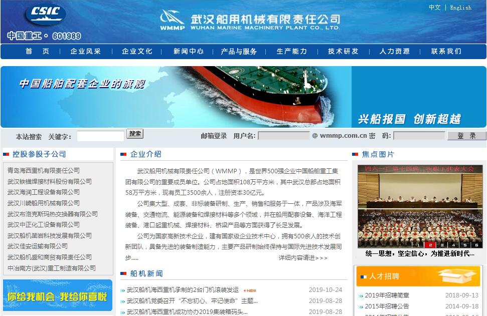 武漢船用機(jī)械有限責(zé)任公司(WMMP),是世界500強(qiáng)企業(yè)中國船舶重工集團(tuán)有限公司的重要成員單位。公司占地面積108萬平方米,其中武漢總部占地面積58萬平方米,現(xiàn)有員工3500余人,注冊資本30億元。公司集大型、成套、非標(biāo)裝備研制、生產(chǎn)、銷售和服務(wù)于一體,產(chǎn)品涉及海軍裝備、交通物流、能源裝備和焊接材料等多個領(lǐng)域,并在船用配套設(shè)備、海洋工程裝備、港口起重機(jī)械、焊接材料、橋梁產(chǎn)品等方面獲得了長足發(fā)展。公司為國家高新技術(shù)企業(yè),建有國家級企業(yè)技術(shù)中心,擁有500余人的技術(shù)創(chuàng)新團(tuán)隊,具備先進(jìn)的裝備制造能力,主要產(chǎn)品研制始終保持與國際先進(jìn)技術(shù)發(fā)展同步。公司旗下?lián)碛星鄭u海西重機(jī)有限責(zé)任公司、武漢鐵錨焊接材料股份有限公司、武漢海潤工程設(shè)備有限公司等3家控股子公司,并與日本川崎重工、德國GEA、中冶南方等國內(nèi)外著名企業(yè)建有合資公司,形成了包括13家控股參股子公司在內(nèi)國際化、集團(tuán)化經(jīng)營格局。
