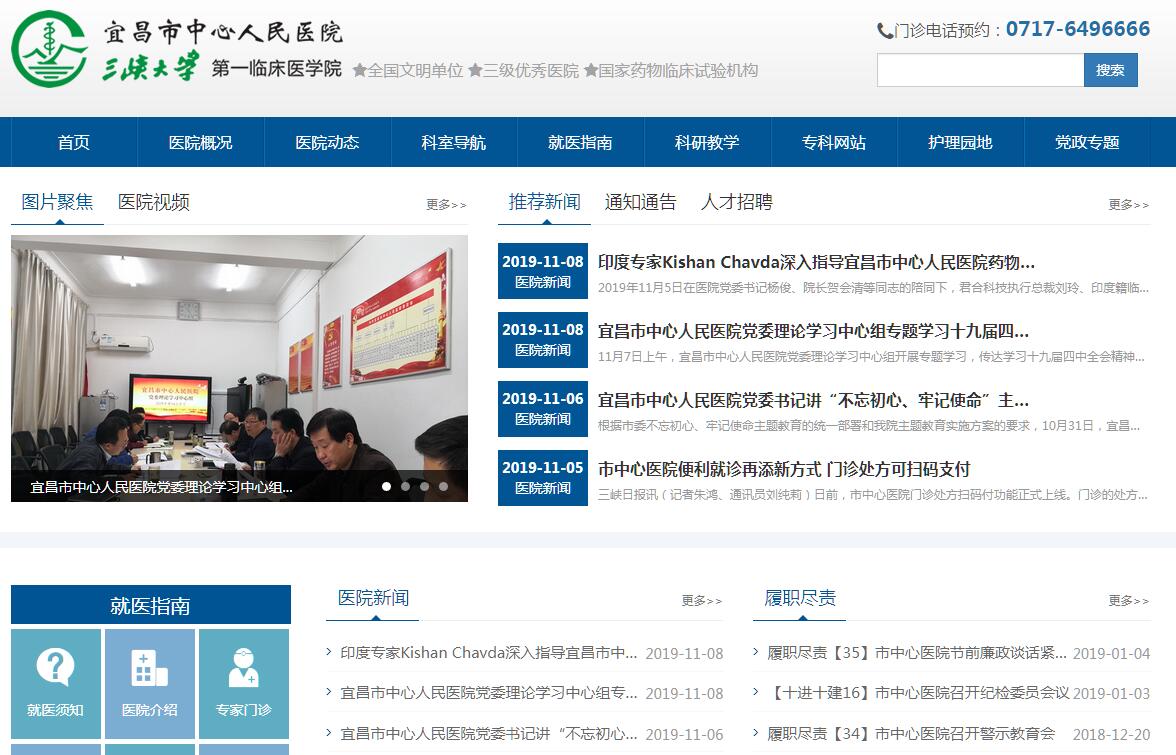 宜昌市中心人民醫(yī)院創(chuàng)立于1949年,2003年納入三峽大學(xué)教學(xué)醫(yī)院系列,掛牌成立三峽大學(xué)第一臨床醫(yī)學(xué)院,2015年增掛三峽大學(xué)附屬中心人民醫(yī)院,是一所集醫(yī)療、預(yù)防、保健、教學(xué)、科研于一體的綜合性三甲醫(yī)院、愛嬰醫(yī)院、美國微笑聯(lián)盟定點(diǎn)醫(yī)院和國際緊急救援中心網(wǎng)絡(luò)醫(yī)院。2008年被省衛(wèi)生廳授予“三級優(yōu)秀醫(yī)院”稱號,2012年被國家衛(wèi)生部等多個(gè)部委聯(lián)合授予“全國綜合醫(yī)院中醫(yī)藥工作示范單位”稱號。2012年5月被省衛(wèi)生廳和宜昌市政府定為建設(shè)區(qū)域性醫(yī)療衛(wèi)生中心依托醫(yī)院。醫(yī)院牢固樹立患者利益至上的核心價(jià)值理念,推行精細(xì)化管理,實(shí)現(xiàn)了跨越式發(fā)展,先后被授予“全國文明單位”、“全國衛(wèi)生先進(jìn)集體”、“全國模范職工之家”、“湖北省五一勞動獎狀”、“湖北省最佳文明單位”、“全省職業(yè)道德建設(shè)十佳單位”“宜昌市行業(yè)作風(fēng)建設(shè)先進(jìn)單位”、“宜昌市消費(fèi)者滿意單位”、“宜昌市三峽質(zhì)量獎”等榮譽(yù)稱號100余項(xiàng)。醫(yī)院將始終恪守“一切為了病人,為了病人一切,質(zhì)量至上,關(guān)愛生命”的院訓(xùn),弘揚(yáng)“團(tuán)結(jié)、敬業(yè)、仁愛、創(chuàng)新”的醫(yī)院精神,堅(jiān)持科學(xué)發(fā)展,注重開拓創(chuàng)新,將醫(yī)院建設(shè)成“立足本市、輻射全省、影響周邊省份”的省域醫(yī)療中心,為人民的健康事業(yè)和祖國的醫(yī)學(xué)教育做出更大的貢獻(xiàn)。