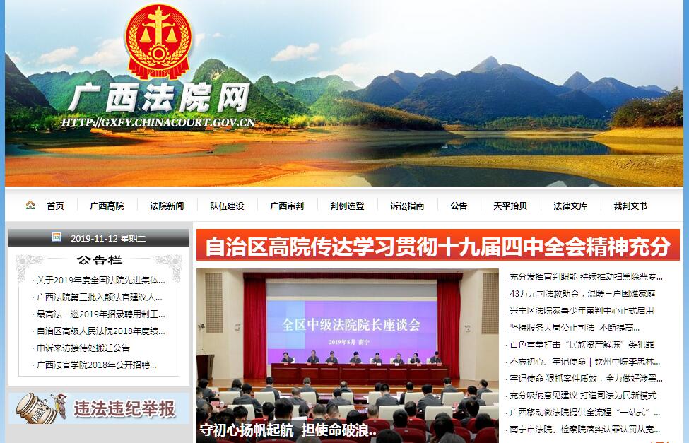 廣西壯族自治區(qū)高級人民法院成立于1950年11月15日,位于廣西壯族自治區(qū)首府南寧市,現(xiàn)有內(nèi)設(shè)機構(gòu)(部門)22個,法官學院1個。其中負責刑事、民商事、行政三大審判業(yè)務的審判庭10個,執(zhí)行局1個,法醫(yī)監(jiān)定中心1個,其他綜合部門10個。全院法官及其他工作人員共282人,其中:法官179人(二級大法官1人,一級高級法官2人,二級高級法官4人,三級高級法官5人,四級高級法官35人,一級法官41人,二級法官52人,三級法官9人,四級法官28人),其他工作人員103人。廣西高級法院作為國家的審判機關(guān),依法獨立行使審判權(quán),對自治區(qū)人民代表大會及其常務委員會負責并報告工作。其主要職責是:1、依法審判法律定由高級法院管轄的和其他認為應當由自己審理的刑事、民事、行政和海事等第一審案件。2、依法審判法律規(guī)定由高級法院管轄刑事、民事、行政和海事等第二審案件。3、依照法律規(guī)定復核死刑案件,根據(jù)最高人民法院受權(quán)核準死刑案件。4、審理最高人民法院指定再審的案件和本轄區(qū)的再審案件。5、審判最高人民法院交由審判的刑事、民事、行政和海事案件。6、依法行使司法執(zhí)行權(quán)和司法決定權(quán),對下級人民法院的執(zhí)行案件進行業(yè)務上監(jiān)督、指導和工作上的統(tǒng)一協(xié)調(diào)、指揮。7、依法決定國家賠償。8、調(diào)查研究審判工作中的法律政策及疑難問題,總結(jié)審判經(jīng)驗;對相關(guān)法律法規(guī)草案提出司法建議。9、領(lǐng)導全區(qū)人民法院的監(jiān)察工作。10、組織、指導全區(qū)法院的思想政治工作、教育培訓工作、法制宣傳工作、司法行政事務工作等工作。