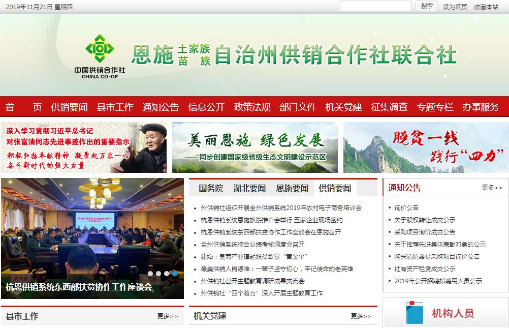 恩施土家族苗族自治州供銷合作社聯合社創(chuàng)建于二十世紀五十年代,是全州供銷合作社聯合社的聯合組織,由州人民政府領導,接受湖北省供銷合作總社的指導,為湖北省供銷合作總社聯合社的成員社,是參照公務員法管理的事業(yè)單位,核定編制21名,目前在職在編人員17人,離退休干部37人,黨組書記、主任分設,領導職數2正3副,監(jiān)事會主任1名,內設6個科室,分別為辦公室、財務審計科、人事監(jiān)察科、經濟發(fā)展科、合作指導科、政策法規(guī)科,社有直屬企業(yè)1個:恩施州供銷社資產經營管理有限公司。恩施州供銷合作社聯合社所轄成員社為:恩施市、利川市、建始縣、巴東縣、宣恩縣、咸豐縣、來鳳縣、鶴峰縣供銷社。2018年,州供銷社在州委、州政府的領導和省供銷總社的指導下,以習近平新時代中國特色社會主義思想為指導,堅定不移推進中央關于深化供銷合作社綜合改革的決定,積極參與鄉(xiāng)村振興,從細從嚴管理社有資產和機關,認真落實全面從嚴治黨和脫貧攻堅等中心工作,完成了年初既定工作任務,服務“三農”的能力得到提升。恩施自治州供銷合作社聯合社工作的主要職責是:(一)、宣傳貫徹執(zhí)行黨中央、國務院,省委、省政府及州委、州政府有關農村經濟工作的方針、政策和法規(guī)。(二)、研究制定全州供銷社的方針戰(zhàn)略和規(guī)劃,指導全州供銷社的改革和發(fā)展,實行開放辦社。(三)、協調有關部門大力推進科技興農,重點指導農產品流通,規(guī)劃、建設、管理市場。(四)、努力為“三農”服務,引導農民發(fā)展商品生產和進人市場,參與和推進農業(yè)產業(yè)化經營,指導專業(yè)合作社的建設。(五)、指導全州供銷社的經營和科技項目的管理,負責對直屬企業(yè)固定資產、投資效益和資產的管理、監(jiān)督,保證社有資產的保值增值。(六)、協同有關部門組織指導全州供銷社發(fā)展對外經濟、貿易和技術合作;協調各級供銷社之間的經濟合作,促進經濟繁榮。(七)、監(jiān)督、檢查各級供銷社對黨和國家有關方針、政策、法規(guī)的執(zhí)行情況和各級政府委托任務。(八)、完成上級交辦的其他事項。