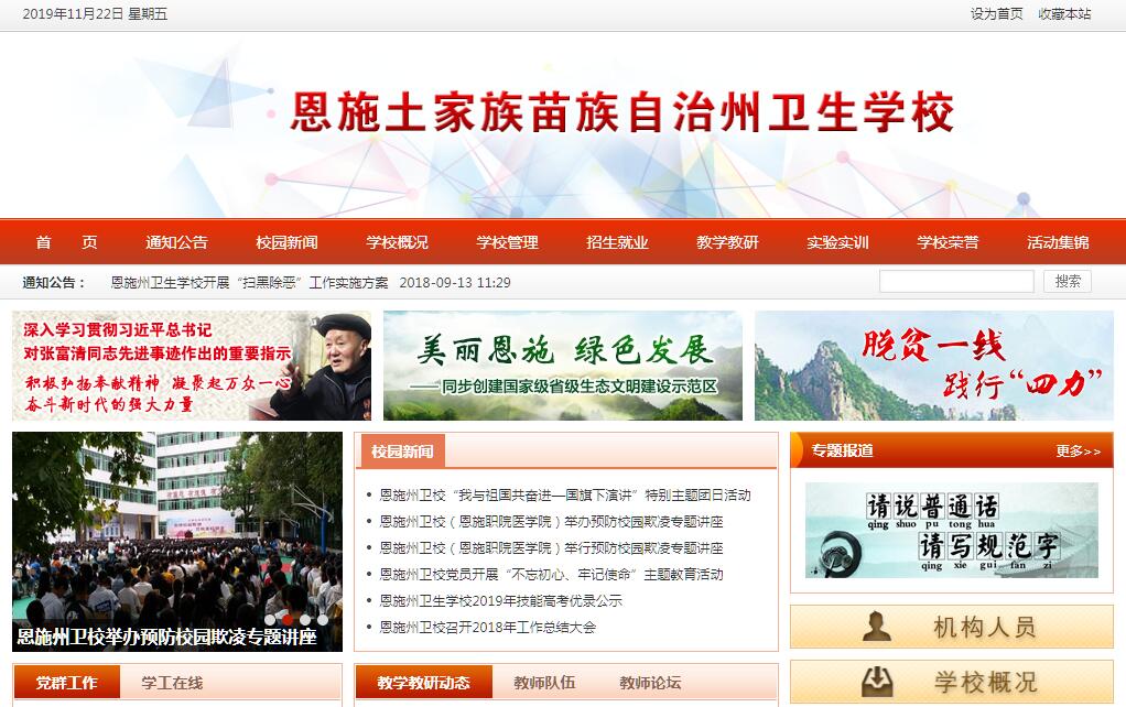 恩施州衛(wèi)生學(xué)校是現(xiàn)在恩施土家族苗族自治州唯一的一所湖北省省級(jí)重點(diǎn)中等職業(yè)學(xué)校,坐落在恩施州風(fēng)景秀麗的五峰山上,其前身為1938年美國(guó)基督教路德會(huì)創(chuàng)辦的高級(jí)護(hù)士學(xué)校,距今已有77年的歷史,培養(yǎng)了數(shù)以萬計(jì)的白衣天使。自辦學(xué)以來,學(xué)校秉承從嚴(yán)治校的傳統(tǒng),不斷改革創(chuàng)新、與時(shí)俱進(jìn),為湖北省、州、縣市醫(yī)療衛(wèi)生機(jī)構(gòu)輸送了大量?jī)?yōu)秀的醫(yī)務(wù)工作者。學(xué)校開設(shè)有護(hù)理、助產(chǎn)、藥劑、醫(yī)學(xué)檢驗(yàn)技術(shù)、康復(fù)技術(shù)、農(nóng)村醫(yī)學(xué)等專業(yè),是一所公辦優(yōu)質(zhì)、特色鮮明的省級(jí)重點(diǎn)中專。近年來,學(xué)校以中專教育為依托,與三峽大學(xué)、湖北中醫(yī)藥大學(xué)、荊州職業(yè)技術(shù)學(xué)院、隨州職業(yè)技術(shù)學(xué)院等高等院校廣泛聯(lián)合辦學(xué),形成了中專、大專、本科多層次的辦學(xué)格局,2015年與荊州職業(yè)技術(shù)學(xué)院聯(lián)辦藥劑專業(yè)“3+2”模式??平逃?。學(xué)校立足恩施,面向基層,服務(wù)醫(yī)療衛(wèi)生事業(yè)發(fā)展,致力于培養(yǎng)“德技雙馨”的衛(wèi)生類專業(yè)高素質(zhì)技術(shù)人才。