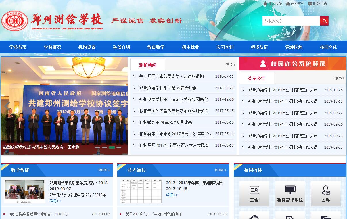 鄭州測繪學(xué)校是全國唯一的一所測繪地理信息職業(yè)學(xué)校,1978年由國家測繪總局創(chuàng)辦,1987年被國家教委確定為全國重點中專,并被定為副廳級單位。2000年被教育部命名為國家級重點中專,同年劃歸省教育廳管理。2012年8月,我校進入國家中職教育改革發(fā)展示范校建設(shè)行列;10月,省政府和國家測繪地理信息局簽訂共建協(xié)議,我校成為全國首所省部(局)共建的中職學(xué)校。我校位于鄭州市大學(xué)南路1號,占地102畝,建筑面積4.8萬平方米;在登封建有占地13畝、建筑面積3000平方米的外業(yè)實訓(xùn)基地。在鄭東新區(qū)獲得362畝的新校區(qū)建設(shè)用地,新校區(qū)規(guī)劃建筑面積20萬平方米?,F(xiàn)有教職工205人,其中專任教師160人;54位教師具有碩士學(xué)位,49位教師具有高級專業(yè)技術(shù)職務(wù),74位教師具有中級專業(yè)技術(shù)職務(wù),“雙師型”教師73人,全日制中專在校生3623人?,F(xiàn)開設(shè)測量工程技術(shù)、航空攝影測量、地圖制圖與地理信息、房產(chǎn)測繪、國土資源調(diào)查等專業(yè),各專業(yè)建有專門的實驗室,并配有與生產(chǎn)單位作業(yè)水平相當?shù)膬x器設(shè)備和軟件系統(tǒng),做到了教學(xué)內(nèi)容與生產(chǎn)實際同步。多年來,畢業(yè)生供不應(yīng)求,并設(shè)有武漢大學(xué)鄭州測校函授站,常年招收成人??坪蛯I緦W(xué)生。學(xué)校堅持中心組學(xué)習(xí)制度、黨委議事制度等,提高班子決策水平;加強支部建設(shè)和黨員隊伍建設(shè),增強黨的凝聚力戰(zhàn)斗力;通過目標責任制、責任追究制等推進黨風廉政建設(shè)。2005年以來,我校黨委每年都獲得省教育廳“五好”基層黨組織稱號;2011年,被表彰為省直機關(guān)先進基層黨委、省直機關(guān)2009-2010年度五好黨委;2012年,被省直工委表彰為創(chuàng)先爭優(yōu)先進黨組織。我校2009年被省政府表彰為河南省職業(yè)教育攻堅工作先進單位;2010年被人社部授予“國家技能人才培育突出貢獻獎獲獎”,被教育部、人社部表彰為全國中等職業(yè)學(xué)校德育工作先進集體。