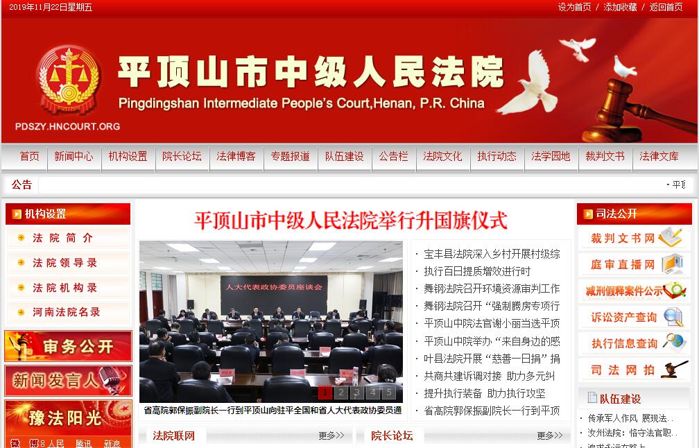 平頂山市中級(jí)人民法院成立于1973年6月,其前身是1956年成立的平頂山礦區(qū)法院?,F(xiàn)有在職人員267人,其中,具有審判職稱162人,中院黨組班子成員9名,審判委員會(huì)專職委員3人。 中院內(nèi)設(shè)部門25個(gè):辦公室、政治部、立案一庭、立案二庭、刑一庭、刑二庭、少審?fù)?、民一庭、民二庭、民三庭、行政庭、賠償辦、審監(jiān)庭、執(zhí)行局、審判管理辦公室(與績(jī)效考核辦公室合署辦公)、研究室、司法技術(shù)鑒定處、司法行政裝備管理處、離退休干部工作處、紀(jì)檢監(jiān)察室、機(jī)關(guān)黨委、法警支隊(duì)、河南法官進(jìn)修學(xué)院平頂山分院、信息科技中心、督查聯(lián)絡(luò)辦公室。中院新址位于市新城區(qū)長(zhǎng)安大道與清風(fēng)路交匯處,2004年12月開工建設(shè),2007年11月16日落成啟用,占地面積63畝。審判綜合大樓高16層,建筑面積23000平方米,使用面積15000平方米,擁有辦公室、會(huì)議室、合議室等近200間,各類審判法庭26個(gè),其中大型審判法庭1個(gè)、中型法庭2個(gè),小型法庭23個(gè),還設(shè)有立案大廳、當(dāng)事人接待室、侯審室、檔案室、閱卷室等審判輔助功能單元,是一座融辦公和審判功能為一體、有深厚的傳統(tǒng)法律文化傳承、溫情的人文關(guān)懷和先進(jìn)的智能化大廈,為平頂山中院的歷史翻開了新的篇章。平頂山中院下轄葉縣、魯山、寶豐、郟縣、汝州、舞鋼、衛(wèi)東、新華、湛河、石龍10 個(gè)基層法院,基層法院現(xiàn)有在職人員961人、 21個(gè)人民法庭。全市年均辦案50000余件,平頂山中院年均辦案5000余件。