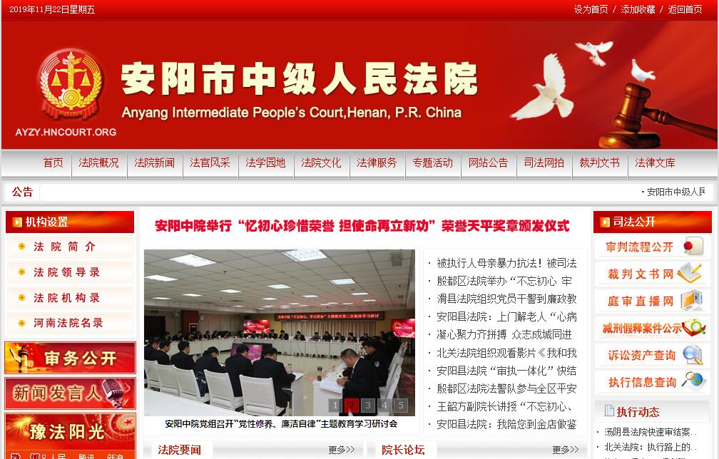 安陽市中級人民法院在編行政事業(yè)工作人員274人,現(xiàn)有279人,其中法官157人,內(nèi)設(shè)27個(gè)部門。轄五縣四區(qū)9個(gè)基層法院,全市兩級法院共有在編工作人員1311人。安陽位于河南省最北部、晉冀豫三省交會處,是中國八大古都之一、國家級歷史文化名城,中國優(yōu)秀旅游城市,是甲骨文的故鄉(xiāng)、《周易》的發(fā)源地。公元前1300年商王盤庚遷都于殷(今安陽市郊小屯一帶),經(jīng)八代十二王,歷時(shí)254年。中華民族最早使用的文字——甲骨文、世界上最大的青銅器——司母戊大方鼎在這里出土問世。另外,著名的文王演易、婦好請纓、蘇秦拜相、西門豹治鄴、岳母刺字等歷史故事都發(fā)生在這里。安陽市總面積7413平方千米,人口536.6萬人,轄林州市、安陽縣、滑縣、內(nèi)黃縣、湯陰縣五縣和文峰區(qū)、北關(guān)區(qū)、殷都區(qū)、龍安區(qū)四區(qū)和高新技術(shù)開發(fā)區(qū)。1949年6月6日安陽解放,古城從此回到了人民的手中;6月下旬,市政府司法科著手組建,1950年4月成立安陽市人民法院。1974年4月16日,安陽市人民法院改為安陽市中級人民法院。目前,安陽市中級人民法院內(nèi)設(shè)辦公室、政治部(下設(shè)人事處、宣傳教育處)、立案第一庭、立案第二庭、刑事審判第一庭、刑事審判第二庭、未成年人案件綜合審判庭、民事審判第一庭、民事審判第二庭、民事審判第三庭、金融審判庭、行政審判庭(賠償委員會辦公室)、企業(yè)破產(chǎn)案件審判庭、審判監(jiān)督庭、執(zhí)行局、研究室、司法警察支隊(duì)、司法行政裝備管理處、司法技術(shù)鑒定處、監(jiān)察處、機(jī)關(guān)黨委、駐市高新技術(shù)產(chǎn)業(yè)開發(fā)區(qū)綜合審判庭、離退休干部管理處、審判管理辦公室、河南法官進(jìn)修學(xué)院安陽分院、機(jī)關(guān)后勤服務(wù)中心等27個(gè)庭、處、室、隊(duì)、辦,下轄9個(gè)基層人民法院。安陽中院成立以來,始終堅(jiān)持黨的領(lǐng)導(dǎo),認(rèn)真履行憲法和法律賦予的神圣職責(zé),緊跟時(shí)代步伐,銳意改革進(jìn)取,依法嚴(yán)厲打擊各類刑事犯罪,積極開展民商事、行政審判及執(zhí)行等各項(xiàng)工作,努力化解各種社會矛盾,為安陽的社會穩(wěn)定、經(jīng)濟(jì)發(fā)展與和諧社會的構(gòu)建提供了強(qiáng)有力的司法保障。八十年代初期,伴隨著改革開放的春風(fēng),安陽中院在新形勢下揭開了審判史上新的一頁。為解決法律法規(guī)明顯滯后于經(jīng)濟(jì)快速發(fā)展的問題,在全省率先成立了研究室,專題研究探索新形勢下法院工作的新途徑;繼之又在全省較早地成立經(jīng)濟(jì)審判庭,專職審理經(jīng)濟(jì)合同糾紛,調(diào)整經(jīng)濟(jì)法律關(guān)系,促進(jìn)經(jīng)濟(jì)協(xié)調(diào)健康發(fā)展;也是在這一時(shí)期,安陽中院堅(jiān)持“嚴(yán)打”方針,有力地懲處了一批嚴(yán)重危害社會治安秩序的犯罪分子,為安陽的經(jīng)濟(jì)發(fā)展?fàn)I造了良好、穩(wěn)定的社會秩序。九十年代,針對軍人軍屬涉法案件的增多,湯陰法院在全國率先成立了“維護(hù)軍人軍屬合法權(quán)益巡回法庭”,受到中央軍委和最高法院肯定,“湯陰經(jīng)驗(yàn)”享譽(yù)全國。2006年,最高法院、解放軍總政治部等六部委授予湯陰法院“維護(hù)國防和軍人軍屬合法權(quán)益先進(jìn)單位”。為使老年人的合法權(quán)益得到保護(hù),安陽縣法院在全國首先創(chuàng)辦了“維護(hù)老年人合法權(quán)益巡回法庭”,他們的經(jīng)驗(yàn)得到全國老齡委的肯定。為此,他們獲得了“全國老年維權(quán)示范崗”殊榮。進(jìn)入二十一世紀(jì),全市法院整體工作步入了快速發(fā)展軌道,各項(xiàng)工作取得新的進(jìn)展。積極推行“大立案,精審判,強(qiáng)執(zhí)行,重監(jiān)督”的審判流程管理摸式,法院審判工作成效明顯,2007年安陽中院被評為“全國法院司法行政工作先進(jìn)單位”。不斷深化審判方式改革,建立以案件質(zhì)量為中心的質(zhì)量評查機(jī)制,審判質(zhì)量和效率進(jìn)一步提高。強(qiáng)化少年審判工作,通過庭前幫教、庭審幫教和庭后延伸幫教,做好未成年人思想道德教育,安陽中院少年庭被共青團(tuán)中央、最高法院授予全國“優(yōu)秀青少年維權(quán)崗”。切實(shí)解決執(zhí)行難,安陽兩級法院建立健全了解決執(zhí)行難問題的有效機(jī)制,使安陽法院執(zhí)行工作初步實(shí)現(xiàn)了良性循環(huán)。大力開展法院文化建設(shè)、廉政文化建設(shè)。開展了“法官格言”征稿比賽、踐行社會主義法治理念演講比賽、法官書畫攝影展、“以案析理”經(jīng)驗(yàn)交流會以及各種文體活動,促進(jìn)了法官整體素質(zhì)的提高,增強(qiáng)了團(tuán)隊(duì)意識。大型話劇《夕陽淚》、豫劇《花喜鵲》在全省巡回演出;以安陽縣法官苗長青為原型創(chuàng)作攝制的電視劇《長青》在中央電視臺播出,弘揚(yáng)了人民法院、人民法官的良好形象,并均獲得省、市“五個(gè)一”工程獎。安陽中院曾連續(xù)5年被最高法院評為“全國法院思想宣傳工作先進(jìn)單位”。2006年,安陽中院被評為“全國法院文化建設(shè)先進(jìn)單位”。持續(xù)開展“人民法官為人民”主題實(shí)踐活動,大力弘揚(yáng)公正、廉
