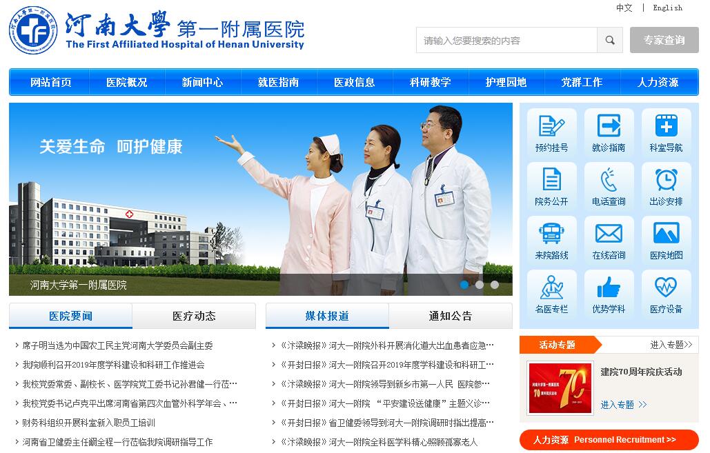 河南大學(xué)第一附屬醫(yī)院始建于1949年,興居八朝都會開封市,2000年并入河南大學(xué),成為河南大學(xué)第一附屬醫(yī)院,六十多年的風(fēng)雨兼程,六十多年的健康發(fā)展,現(xiàn)已成為一所集醫(yī)療、教學(xué)、科研、預(yù)防、康復(fù)和急救為一體的省直綜合性三級醫(yī)院。是國家首批全科醫(yī)師規(guī)范化培訓(xùn)基地、國家住院醫(yī)師規(guī)范化培訓(xùn)基地、教育部卓越醫(yī)生教育培訓(xùn)計劃基地、國家衛(wèi)計委腦卒中定點監(jiān)測醫(yī)院、國家糖尿病早期檢測開封分中心、衛(wèi)計委國際緊急救援中心網(wǎng)絡(luò)醫(yī)院、國家衛(wèi)計委內(nèi)鏡與微創(chuàng)培訓(xùn)基地、省政府指定的人身傷害醫(yī)學(xué)重新鑒定醫(yī)院、河南大學(xué)司法鑒定中心、河南省高血壓控制研究中心開封分中心,省市新型農(nóng)村合作醫(yī)療、開封市醫(yī)療保險、城鎮(zhèn)居民醫(yī)療保險等定點醫(yī)院。目前,醫(yī)院開放床位1600余張,職工1700余人,教授、副高級以上職稱、博士300余人,享受國務(wù)院特殊津貼1人,河南省政府特殊津貼1人,河南省科技特聘學(xué)科帶頭人1人,河南省青年科技后備人才8人,黃河學(xué)者3人,70余人分別擔(dān)任國家級、省、市級專業(yè)學(xué)會主委、委員。近年來,醫(yī)院不斷加強國內(nèi)交流,建立了培訓(xùn)基地,定期選派科室骨干外出進行學(xué)術(shù)交流和技術(shù)培訓(xùn),為學(xué)科發(fā)展提供堅實保障。細(xì)化規(guī)范學(xué)科門類,是開封市(豫東地區(qū))專業(yè)設(shè)置最為齊全的綜合性醫(yī)院。醫(yī)療技術(shù)精湛,60年代在省內(nèi)外率先開展了結(jié)腸代食管術(shù)、70年代開展芫花引產(chǎn)技術(shù)、80年代開展前列腺氣化電切術(shù)、90年代開展腦立體定向技術(shù)治療帕金森病等。目前開展的復(fù)雜心臟病手術(shù)治療、心腦血管病介入治療、多學(xué)科微創(chuàng)治療、腫瘤適型調(diào)強治療、腫瘤個體化治療等已達到省內(nèi)領(lǐng)先、國內(nèi)先進水平,成為豫東唯一品牌。擁有腫瘤學(xué)、神經(jīng)病學(xué)、心血管外科學(xué)、消化病學(xué)、醫(yī)學(xué)影像學(xué)等10個省醫(yī)學(xué)重點學(xué)科,普通外科學(xué)、神經(jīng)外科學(xué)等3個重點培育學(xué)科;口腔醫(yī)學(xué)、臨床醫(yī)學(xué)2個省教育廳重點學(xué)科;醫(yī)院擁有河南省神經(jīng)疾病國際聯(lián)合實驗室、河南省醫(yī)學(xué)腫瘤分子免疫重點實驗室、開封市分子影像與腫瘤分子免疫重點實驗室、河南大學(xué)腫瘤中心、河南大學(xué)神經(jīng)疾病研究所等9個科研機構(gòu)。擁有省級、校級、市級、院級科技創(chuàng)新團隊6個;設(shè)有院內(nèi)青年創(chuàng)新基金,近年來醫(yī)院科研立項總數(shù)達180余項,國家自然基金項目獲批20項,其中國家自然科學(xué)基金國際合作重點項目填補了河南省衛(wèi)生系統(tǒng)臨床醫(yī)學(xué)類該項目的空白。醫(yī)院是河南省培養(yǎng)高級醫(yī)療衛(wèi)生人才的教學(xué)基地,是臨床醫(yī)學(xué)一級學(xué)科專業(yè)型及學(xué)術(shù)型碩士學(xué)位授權(quán)單位,涵蓋20個二級學(xué)科,承擔(dān)河南大學(xué)醫(yī)藥護技本、碩教學(xué)任務(wù),研究生導(dǎo)師100余人。擁有國家級“卓越醫(yī)生教育培養(yǎng)計劃”項目1項,國家級大學(xué)生創(chuàng)新創(chuàng)業(yè)實驗項目3項,省級教改項目3項。 醫(yī)院擁有美國GE750寶石能譜CT、美國GE750 3.0T磁共振、德國西門子數(shù)字減影血管造影機(DSA)、高清超聲內(nèi)鏡等一大批先進的醫(yī)療設(shè)備,SPECT-CT、PET-CT,PET-MR的投入使用,成為同時擁有PET-CT、PET-MRI的單位,與院基因診斷中心結(jié)合,實現(xiàn)了診斷手段從影像學(xué)向分子學(xué)的跨越。醫(yī)院信息化建設(shè)智能化,緊跟時代發(fā)展,將“流程再造”成為醫(yī)院信息化建設(shè)的核心,轉(zhuǎn)變經(jīng)營戰(zhàn)略改進服務(wù)模式,最終實現(xiàn)病人的更滿意。醫(yī)院為省級文明單位標(biāo)兵,先后榮獲 “全國百姓放心醫(yī)院”、中華全國總工會授予“全國模范職工之家”;中華全國總工會教科文衛(wèi)體工會授予“抗震救災(zāi),重建家園工人先鋒號”;國家衛(wèi)計委授予“志愿服務(wù)在醫(yī)院活動先進單位”;河南省五一勞動獎狀,河南省衛(wèi)計委授予“河南省健康促進示范性醫(yī)院”、“河南省群眾滿意醫(yī)院”、“醫(yī)政管理先進單位” 、“優(yōu)質(zhì)護理服務(wù)先進單位” 、“行風(fēng)建設(shè)先進單位”、“健康中原先鋒崗”、“新農(nóng)合先進單位”、“信息化管理先進單位”、“醫(yī)院創(chuàng)新管理先進單位”、“衛(wèi)生文化建設(shè)先進單位”、河南省高校工委授予“先進基層黨組織”等多項榮譽。在《開封市醫(yī)療衛(wèi)生資源區(qū)域規(guī)劃(2009)》和河南省衛(wèi)計委、河南省發(fā)展與改革委員會《鄭汴新區(qū)區(qū)域衛(wèi)生發(fā)展與資源配置規(guī)劃(2010)》中,我院在開封市新區(qū)河南大學(xué)校園旁另有規(guī)劃占地360余畝的新院區(qū),啟動一院兩地建設(shè)規(guī)劃,新院區(qū)一期工程建成時新增床位500張,建筑面積29萬平方米,集醫(yī)療、教學(xué)、科研、預(yù)防、