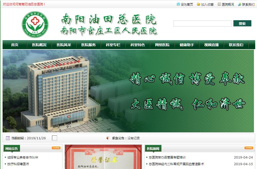 河南石油勘探局職工醫(yī)院(南陽市官莊工區(qū)人民醫(yī)院)始建于1972年,現(xiàn)已發(fā)展成為集醫(yī)療、教學、科研、康復、保健為一體的國家三級綜合醫(yī)院。服務范圍已從油田區(qū)域輻射到周邊兩省六縣(區(qū)),1996年被衛(wèi)生部和世界衛(wèi)生組織評審為“愛嬰醫(yī)院”。近年來,相繼成為“河南省城鎮(zhèn)職工基本醫(yī)療保險定點醫(yī)療單位”、南陽市市直職工和城鎮(zhèn)居民醫(yī)療保險、新型農(nóng)村合作醫(yī)療城市定點醫(yī)院、官莊工區(qū)新型農(nóng)村合作醫(yī)療定點醫(yī)院、鄭州大學、新鄉(xiāng)醫(yī)學院、南陽醫(yī)專教學實習醫(yī)院、南陽市120急救網(wǎng)絡(luò)醫(yī)院、河南省醫(yī)療機構(gòu)醫(yī)學檢驗、醫(yī)學影像、病理檢查結(jié)果互認醫(yī)院。設(shè)有解放軍總醫(yī)院(301醫(yī)院)遠程醫(yī)療系統(tǒng)。同時又是“中國糖尿病綜合防治計劃定點推廣單位”、河南省人民醫(yī)院、鄭州大學第一附屬醫(yī)院、省胸科醫(yī)院等醫(yī)院協(xié)作單位、油區(qū)法醫(yī)鑒定中心等。醫(yī)院先后被評為河南省衛(wèi)生先進單位、南陽市衛(wèi)生系統(tǒng)先進單位、南陽市消費者信得過單位等稱號。醫(yī)院曾被評為河南省、南陽市“三好一滿意”活動等先進單位,河南省衛(wèi)生系統(tǒng)構(gòu)建和諧醫(yī)患關(guān)系工作先進單位,被省衛(wèi)生廳綜合評價為A級醫(yī)院。全院現(xiàn)有職工911名,擁有專業(yè)技術(shù)人員857人,其中:主任醫(yī)師19人、副主任醫(yī)師68人、中級職稱268人。醫(yī)院核定床位600張。設(shè)置有20多個臨床科室和近10個醫(yī)技科室。擁有雙源CT、雙排CT、直線加速器、核磁共振、全數(shù)字四維多功能彩超、C型臂心血管造影機、DR高端X線數(shù)字成像系統(tǒng)、腹腔鏡、Leep環(huán)切電刀、三U白內(nèi)障超聲乳化儀、電子胃鏡、全自動生化分析儀、EX-2100全自動血液分析儀、UF100全自動尿沉渣分析儀、體外沖擊波碎石機、前列腺電切鏡、宮腔鏡等先進醫(yī)療設(shè)備300余臺套。全院年均收治病人20000余人次,門診工作量51萬余人次,急診搶救病人3000人次,大中型手術(shù)3200余例,且主要醫(yī)療技術(shù)指標保持較高水平。醫(yī)院堅持以人才為根本,以技術(shù)為主體,以??茷樘厣目萍寂d院發(fā)展戰(zhàn)略,相繼建成了消化道內(nèi)鏡介入、腔鏡診療、腦血管病診療、高血壓病診療、糖尿病診療、肝病診療、血液凈化、遠程醫(yī)療、疼痛診療、乳腺病診療等醫(yī)療特色,并有心內(nèi)科、普外科、神經(jīng)內(nèi)科、感染科、內(nèi)分泌科、婦產(chǎn)科、耳鼻喉科、骨科、兒科和呼吸內(nèi)科被批準為河南省、南陽市重點、特色???,醫(yī)療服務質(zhì)量持續(xù)提高。