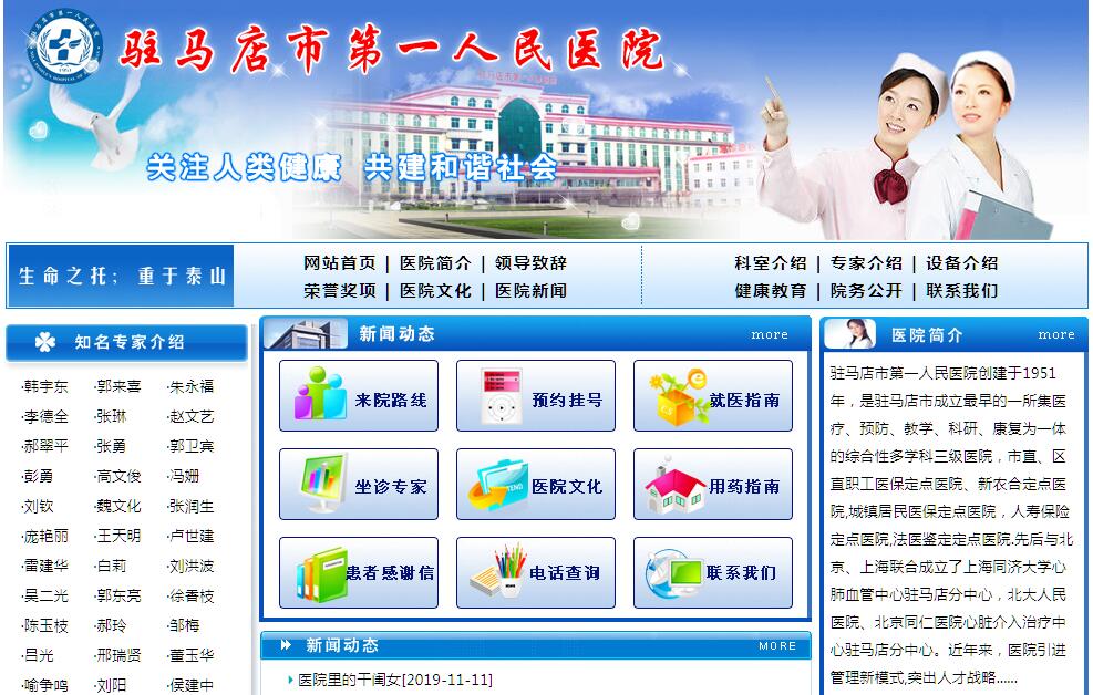 駐馬店市第一人民醫(yī)院創(chuàng)建于1951年,是一所集醫(yī)療、預(yù)防、教學(xué)、科研、康復(fù)為一體的綜合性多學(xué)科三級醫(yī)院。市、區(qū)(縣)職工醫(yī)保定點醫(yī)院、新農(nóng)合定點醫(yī)院,城鎮(zhèn)居民醫(yī)保定點醫(yī)院,人壽保險定點醫(yī)院,法醫(yī)鑒定定點醫(yī)院。醫(yī)院編制床位1500張,各類臨床、醫(yī)技科室60余個。全院共有職工1509余人,其中高級職稱人員170人,中級職稱人員560人。近年來,醫(yī)院引進(jìn)管理新模式,突出人才戰(zhàn)略,加強(qiáng)專科建設(shè),創(chuàng)新服務(wù)理念,堅持以真情服務(wù)病人,以奉獻(xiàn)贏得民心,在全市人民心目中樹立了良好的社會形象,醫(yī)院取得了突飛猛進(jìn)的發(fā)展,使醫(yī)院的社會效益和經(jīng)濟(jì)效益得到同步增長,先后榮獲“省級衛(wèi)生先進(jìn)單位”、“河南省行風(fēng)評議先進(jìn)單位”、“省廣告宣傳誠信單位”、“省誠信醫(yī)療單位”、“市級優(yōu)質(zhì)服務(wù)十佳醫(yī)院”、“全市醫(yī)院管理先進(jìn)單位”、“市級消費者信得過單位”等榮譽稱號。醫(yī)院設(shè)有心內(nèi)科,神經(jīng)內(nèi)科,呼吸科,消化科,內(nèi)分泌科,中西醫(yī)結(jié)合科,腎內(nèi)科,血液透析科,腫瘤科,血液科,腫瘤放療科,風(fēng)濕免疫科、全科醫(yī)學(xué)科、普外科,泌尿外科,骨外科,心胸外科、神經(jīng)外科,疼痛介入科、婦產(chǎn)科,小兒內(nèi)科,新生兒科,小兒康復(fù)科,皮膚科、眼科,耳鼻喉科,口腔科,急診科,健康體檢站等。其中以心臟病介入治療而聞名,以婦產(chǎn)科為名牌,以骨科專業(yè)為特色,以小兒科專業(yè)為優(yōu)勢,開展的準(zhǔn)分子激光治療近視以其技術(shù)精湛,療效顯著,深受患者歡迎。近年來,醫(yī)院先后從美國、德國、日本引進(jìn)了先進(jìn)的大型醫(yī)療設(shè)備,如在豫南首家引進(jìn)的大型C型臂血管造影及介入治療系統(tǒng),128層螺旋CT機(jī),豫南首臺高強(qiáng)度超聲聚焦刀,飛秒激光近視治療系統(tǒng),超導(dǎo)型光纖磁共振系統(tǒng),高能直線加速器-X刀,E9四維彩超,眼科OCT,鉬靶乳腺機(jī),高頻數(shù)字胃腸機(jī),電視腹腔鏡,彩色經(jīng)顱多普勒,乳腺掃描儀,動態(tài)心電圖儀,血液透析儀,纖維支氣管鏡,肺功能測定,光電嫩膚平臺,雙能X線骨密度檢測儀,電子胃、腸鏡,前列腺氣化電切鏡,關(guān)節(jié)鏡,軟性神經(jīng)內(nèi)鏡,大型生化分析儀及微創(chuàng)治療設(shè)備椎間盤鏡、經(jīng)皮腎鏡、輸尿管鏡、宮腔鏡等先進(jìn)設(shè)備400余臺(件)。醫(yī)院新建設(shè)完成的病房綜合大樓,地下1層地上19層,總建筑面積近3萬平方米,病房樓內(nèi)處處體現(xiàn)出以人為本的設(shè)計理念,布局科學(xué)、結(jié)構(gòu)合理、設(shè)施先進(jìn)、智能化程度高,整個病房樓顯得標(biāo)準(zhǔn)規(guī)范、溫馨舒適。內(nèi)設(shè)有層流手術(shù)室、婦產(chǎn)科及標(biāo)準(zhǔn)化產(chǎn)房、重癥醫(yī)學(xué)科、新生兒重癥監(jiān)護(hù)病區(qū)、心內(nèi)科、心胸外科等手術(shù)科室。病房內(nèi)四季如春,冬有暖氣,夏有空調(diào),設(shè)有床頭電子傳呼系統(tǒng),病房中心供氧系統(tǒng),高檔可調(diào)式鋼折疊床,獨立衛(wèi)生間,房間配備有電視,讓患者一進(jìn)病區(qū)就能充分感受到賓館化服務(wù)。充滿人性化設(shè)計的門診樓布局合理,設(shè)施完備,功能齊全,設(shè)置有各類專業(yè)診室近百間,配備有全自動電梯及大型電子顯示屏,就診路線一目了然,并開展全程護(hù)士導(dǎo)醫(yī)服務(wù)。舒適的就醫(yī)環(huán)境,充分體現(xiàn)出醫(yī)院“一切為病人、為病人一切、為一切病人”的辦院宗旨。醫(yī)院稟承“誠信、求實、和諧、創(chuàng)新”的醫(yī)院精神,始終堅持“科技興院、誠信立院、質(zhì)量強(qiáng)院、服務(wù)揚院”的辦院方針。遵循“用一流的服務(wù)、一流的質(zhì)量、一流的技術(shù)服務(wù)天中人民”的醫(yī)院使命。恪守“生命之托,重于泰山”之院訓(xùn)。努力實現(xiàn)“讓社會滿意、讓患者滿意”的醫(yī)院目標(biāo),以優(yōu)美的就診環(huán)境,強(qiáng)大的專家陣容,先進(jìn)的醫(yī)療設(shè)備,低廉的收費價格,竭誠為廣大患者提供更加周到優(yōu)質(zhì)的服務(wù)。