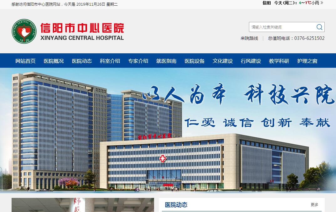 信陽市中心醫(yī)院創(chuàng)建于1920年,1998年更名為信陽市中心醫(yī)院,是一所集醫(yī)療、急救、科研、教學(xué)、預(yù)防、保健、康復(fù)為一體的三級(jí)甲等綜合醫(yī)院。醫(yī)院總占地面積5.2萬平方米,建筑面積9.8萬平方米,編制床位1500張,實(shí)際開放床位1762余張,年門(急)診114萬人次,年出院病人7.36萬多人次,年住院患者手術(shù)人數(shù)2萬余例。醫(yī)院擬計(jì)劃總投資20億元,總建筑面積25.2萬平方米,設(shè)置病床1800張,按現(xiàn)代化“三級(jí)甲等醫(yī)院”標(biāo)準(zhǔn)建設(shè)的新院區(qū)正在建設(shè)之中,將于2019年底投入使用。醫(yī)院現(xiàn)有在崗職工2723人,專業(yè)技術(shù)人員2304人,其中高級(jí)職稱344人,醫(yī)學(xué)博士、醫(yī)學(xué)碩士研究生391人,享受政府津貼5人,信陽市專業(yè)技術(shù)拔尖人才8人,有40多名專家在省、市醫(yī)學(xué)會(huì)擔(dān)任主任或副主任委員職務(wù)。醫(yī)院設(shè)施設(shè)備先進(jìn),擁有Elekat synergy(醫(yī)科達(dá))直線加速器、飛利浦3.0T核磁共振全身掃描儀、西門子1.5T核磁共振、飛利浦256排螺旋CT、西門子64排螺旋CT、美國GE經(jīng)濟(jì)型PET-CT、SPECT、直線加速器、血管造影機(jī)、電子胃鏡、關(guān)節(jié)鏡等1000余臺(tái)(件)國際大型醫(yī)療設(shè)備,為臨床提供科學(xué)、準(zhǔn)確的診斷依據(jù)。醫(yī)院共設(shè)56個(gè)臨床、醫(yī)技科室,設(shè)有國家住院醫(yī)師規(guī)范化培訓(xùn)基地、國家高級(jí)卒中中心、中華醫(yī)學(xué)會(huì)臨床藥學(xué)分會(huì)臨床藥師培訓(xùn)中心、中華醫(yī)學(xué)會(huì)疼痛學(xué)分會(huì)臨床培訓(xùn)醫(yī)院、中華醫(yī)學(xué)會(huì)“華佗工程—腹膜透析置管手術(shù)規(guī)范化項(xiàng)目實(shí)踐培訓(xùn)基地”、省級(jí)胸痛中心、省級(jí)創(chuàng)傷中心、信陽市高危孕產(chǎn)婦救治中心、信陽市危重新生兒救治中心等。疼痛科為省級(jí)醫(yī)學(xué)臨床特色???,泌尿外科、內(nèi)分泌科、急診科、心血管科為市級(jí)重點(diǎn)???。近年來,相繼開展急性缺血性腦梗死靜脈溶栓介入取栓技術(shù)、急診PCI、心臟不停跳冠脈搭橋術(shù)、經(jīng)尿道輸尿管軟鏡鈥激光碎石術(shù)、內(nèi)窺鏡下逆行胰-膽管造影(ERCP)、腦動(dòng)脈瘤夾閉術(shù)、胸腔鏡下食管癌根治術(shù)、惠普爾氏術(shù)(根治性胰十二指腸切除術(shù))、植骨術(shù)在重度牙周病治療中的應(yīng)用、以及各種微創(chuàng)、介入、無痛診療技術(shù),系列內(nèi)窺鏡診療等100多項(xiàng)新技術(shù)填補(bǔ)了信陽市醫(yī)療技術(shù)空白,部分診療技術(shù)達(dá)到省級(jí)先進(jìn)水平。先后獲得國家級(jí)、省級(jí)科研項(xiàng)目10余項(xiàng),每年獲省、市科學(xué)技術(shù)進(jìn)步獎(jiǎng)10余項(xiàng),每年在國家級(jí)核心期刊、省級(jí)期刊發(fā)表學(xué)術(shù)論文400余篇。醫(yī)院與國家、省級(jí)醫(yī)院建立醫(yī)療聯(lián)盟,組建了“信陽市中心醫(yī)院醫(yī)療集團(tuán)”,現(xiàn)有23家成員單位。實(shí)施智慧醫(yī)療、分級(jí)診療、雙向轉(zhuǎn)診和預(yù)約診療服務(wù),將門診60%號(hào)源作為預(yù)約掛號(hào)號(hào)源管理,現(xiàn)有微信、手機(jī)APP等6種預(yù)約診療方式。醫(yī)院始終堅(jiān)持“以人為本,科技興院”的院訓(xùn),秉承“仁愛、誠信、創(chuàng)新、奉獻(xiàn)”的醫(yī)院精神,持續(xù)改善服務(wù)態(tài)度、提高服務(wù)質(zhì)量、美化服務(wù)環(huán)境、優(yōu)化服務(wù)流程,落實(shí)惠民政策,使醫(yī)院逐步成為百姓放心、群眾滿意的品牌醫(yī)院。醫(yī)院先后榮獲“全國模范職工之家”、“河南省文明單位”、“河南省衛(wèi)生先進(jìn)單位”、“河南省衛(wèi)生系統(tǒng)先進(jìn)集體”等幾十項(xiàng)榮譽(yù)稱號(hào)。與時(shí)俱進(jìn)樹大醫(yī)風(fēng)范,誠信惠民獻(xiàn)仁慈愛心。信陽市中心醫(yī)院黨委堅(jiān)持以團(tuán)結(jié)、干事、創(chuàng)業(yè)、廉潔、高效的工作作風(fēng),帶領(lǐng)全院職工滿載燦爛的精神文明之花,豐碩的物質(zhì)文明之果,緊緊圍繞“深化改革、以人為本、科技興院、謀求發(fā)展、再鑄輝煌”的發(fā)展思路,向著“管理科學(xué),服務(wù)優(yōu)質(zhì),技術(shù)先進(jìn),設(shè)備精良,質(zhì)量一流,環(huán)境優(yōu)雅”的大型現(xiàn)代化三級(jí)甲等綜合醫(yī)院的目標(biāo)闊步前進(jìn)!