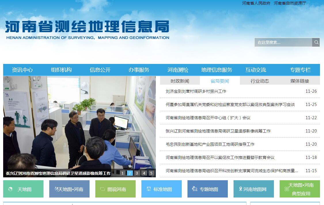 河南省測繪地理信息局成立于1974年,為河南省國土資源廳管理的事業(yè)單位,行使全省測繪行政管理的職能。局機(jī)關(guān)內(nèi)設(shè)辦公室、法規(guī)與行業(yè)管理處、國土測繪處、測繪成果與地圖管理處(地理信息應(yīng)用處)、規(guī)劃財(cái)務(wù)處、人事教育處和直屬機(jī)關(guān)黨委。局直屬事業(yè)單位有河南省測繪工程院、河南省遙感測繪院、河南省地圖院、河南省基礎(chǔ)地理信息中心、河南省測繪地理信息局信息中心、河南省測繪產(chǎn)品質(zhì)量監(jiān)督站、河南省測繪發(fā)展研究中心、河南省測繪資料檔案館和河南省測繪地理信息局后勤服務(wù)中心。全局現(xiàn)有在職職工620人,專業(yè)技術(shù)人員435人,占在職職工總數(shù)70%以上,具有高、中級專業(yè)技術(shù)職務(wù)人員260人。其主要職責(zé)是:(一)起草全省測繪地理信息的行政法規(guī)和規(guī)章草案,擬訂測繪地理信息事業(yè)發(fā)展規(guī)劃,會(huì)同有關(guān)部門擬訂全省基礎(chǔ)測繪規(guī)劃,擬訂測繪地理信息行業(yè)管理政策、技術(shù)標(biāo)準(zhǔn)并監(jiān)督實(shí)施。(二)負(fù)責(zé)基礎(chǔ)測繪、行政區(qū)域界線測繪、地籍測繪和其他全省性或重大測繪項(xiàng)目的組織和管理工作,建立健全和管理全省測繪基準(zhǔn)和測量控制系統(tǒng)。(三)擬訂地籍測繪規(guī)劃、技術(shù)標(biāo)準(zhǔn)和規(guī)范,確認(rèn)地籍測繪成果。(四)承擔(dān)規(guī)范測繪地理信息市場秩序的責(zé)任。負(fù)責(zé)測繪資質(zhì)資格管理和測繪任務(wù)登記工作,監(jiān)督管理測繪成果質(zhì)量和地理信息獲取與應(yīng)用等測繪活動(dòng),組織協(xié)調(diào)地理信息安全監(jiān)管工作,審批對外提供測繪成果和外國組織、個(gè)人來豫測繪。組織查處測繪違法案件。負(fù)責(zé)測繪行政復(fù)議工作。(五)承擔(dān)組織提供測繪地理信息公共服務(wù)和應(yīng)急保障的責(zé)任。組織、指導(dǎo)基礎(chǔ)地理信息社會(huì)化服務(wù),審核并根據(jù)授權(quán)公布重要地理信息數(shù)據(jù)。(六)負(fù)責(zé)管理全省基礎(chǔ)測繪成果,指導(dǎo)、監(jiān)督各類測繪成果的管理和全省測量標(biāo)志的保護(hù),擬訂測繪成果匯交制度并監(jiān)督實(shí)施。(七)承擔(dān)地圖管理的責(zé)任。監(jiān)督管理全省地圖市場,管理地圖編制工作,審查向社會(huì)公開的地圖,管理并核準(zhǔn)地名在地圖上的表示,與有關(guān)部門共同擬訂河南省地圖的省界線標(biāo)準(zhǔn)樣圖。(八)負(fù)責(zé)測繪科技創(chuàng)新相關(guān)工作,指導(dǎo)測繪基礎(chǔ)研究、重大測繪科技攻關(guān)以及科技推廣和成果轉(zhuǎn)化,開展測繪地理信息對外合作與交流。