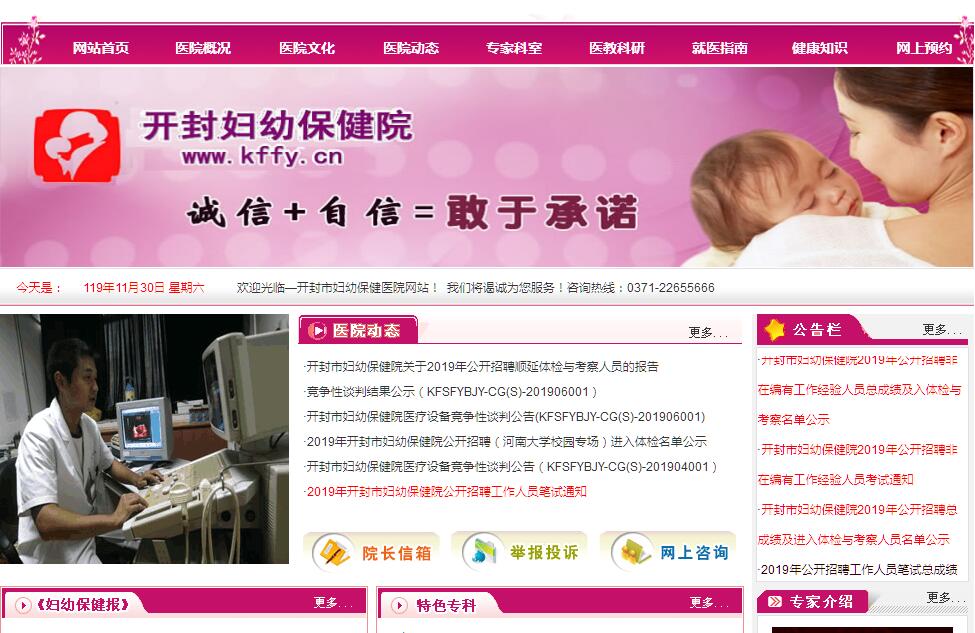 開封市婦幼保健院始建于1962年,恢復重建于1980年,1988年搬至由聯(lián)合國兒童基金會捐助的現院址,是一家集醫(yī)療、保健、教學、科研、培訓和指導于一體的二級甲等婦幼保健院,承擔著全市近600萬婦女兒童的醫(yī)療、保健以及婦產兒童專業(yè)技術人員的業(yè)務培訓和技術指導任務,是開封市首批審核通過的國家級愛嬰醫(yī)院。醫(yī)院占地20余畝,環(huán)境優(yōu)美,交通便利?,F有職工443人,其中高級衛(wèi)生技術人員133人,形成了一支政治過硬、技術精湛、醫(yī)德高尚的衛(wèi)生人才隊伍。醫(yī)院核定床位213張,全年門診量達26.5萬人次,收治婦科、產科、兒科、康復科住院患者達2萬人次,其中產科住院分娩7325人。全年產科分娩量位居開封市首位。作為中國醫(yī)師協(xié)會基層婦科內分泌培訓基地之一,開封市孕產婦急救中心,開封市婦女保健院重點???,開封市醫(yī)保、新農合定點單位,醫(yī)院干部職工始終秉承著“以病人為中心”的服務理念,堅持病人第一、服務第一、質量第一、信譽第一、全心全意為婦女兒童服務的辦院宗旨,堅持走特色辦院之路,學科發(fā)展和特色專業(yè)建設取得了突出成績。目前開展婦科、產科、兒科、新生兒科、兒童康復科、優(yōu)生遺傳科、生殖不孕科、乳腺科、婦女保健科、兒童保健科、圍產保健科等40多個專業(yè)科室,病房全部為賓館式家化病房。醫(yī)院開展的氣囊助產、胎兒監(jiān)護、陰道鏡手術、Leep刀手術,廣泛性子宮切除術,產前診斷、新生兒遺傳代謝疾病篩查等均處于省市領先水平。產科實行產前、產時、產后系列服務,開設無痛分娩、導樂陪伴分娩和丈夫陪產等人性化助產服務;兒科重癥監(jiān)護技術日漸成熟,全面介入高?;純悍置涞募纯虛尵龋瑸楫a科安全分娩提供了可靠保障。婦科開展的宮腔鏡、腹腔鏡等微創(chuàng)手術,現已成為廣大婦女最為信賴的特色服務;同時開設母乳喂養(yǎng)門診,為母兒健康提供了保障。宮腔鏡、腹腔鏡、電子陰道鏡、可視人流、高端全數字化四維彩超、數字X線攝片機(DR)、多功能心電監(jiān)護設備、全自動生化分析儀、唐氏篩查儀、新生兒聽力篩查系統(tǒng)、新生兒呼吸機等萬元以上醫(yī)療設備200余件。醫(yī)院的快速發(fā)展吸引了豫東地區(qū)的廣大患者前來咨詢治療,為患者提供全方位優(yōu)質服務,滿足了不同患者的需求,同時也牢牢確立了開封地區(qū)婦幼專業(yè)的龍頭地位。近年來,信息化建設不斷推進,實現了醫(yī)生護士工作站、電子病歷,自助服務系統(tǒng)等,為今后醫(yī)院進一步發(fā)展奠定了現代化的信息管理基礎。醫(yī)院先后榮獲了全國三八紅旗集體、全國巾幗文明崗、國家級愛嬰醫(yī)院、河南省思想道德建設先進單位、省十佳婦幼保健院、省級文明單位、省級衛(wèi)生單位等眾多國家、省市級榮譽稱號。展望未來,我們將繼續(xù)秉承著“仁愛 尚德 求精 惠民” 這8字院訓,視患者為親人,將患者滿意作為服務的最高境界,為群眾提供高質量的服務,不斷提升醫(yī)療保健服務品質,為打造一流的現代化婦幼保健院而努力奮斗!