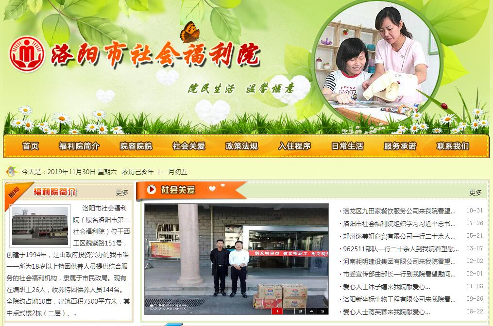 洛陽市社會(huì)福利院(原名洛陽市第二社會(huì)福利院)位于西工區(qū)魏紫路151號,創(chuàng)建于1994年,是由政府投資興辦的我市唯一一所為18歲以上特困供養(yǎng)人員提供綜合服務(wù)的社會(huì)福利機(jī)構(gòu),隸屬于市民政局?,F(xiàn)有在編職工26人,收養(yǎng)特困供養(yǎng)人員144名。全院約占地10畝,建筑面積7500平方米,其中點(diǎn)式樓2棟(二層)、公寓樓1棟(六層),可設(shè)床位150張。自1994年10月開業(yè)以來,按照“以民為本,為民解困,為民服務(wù)”的宗旨,認(rèn)真做好特困供養(yǎng)人員的服務(wù)及管理工作。我院特困人員的來源:一是由市兒童福利院送養(yǎng)的年滿18周歲以上的孤殘人員。二是由市救助管理站送養(yǎng)的流浪乞討人員。三是由城市各轄區(qū)送養(yǎng)的人員。社會(huì)福利院是精神文明建設(shè)的重要陣地,是把黨的溫暖送到千家萬戶的窗口單位。建院至今,院支部十分重視精神文明建設(shè),并把精神文明建設(shè)納入到日常工作中。經(jīng)常教育干部職工,把院民當(dāng)親人,視老人如家人,加強(qiáng)工作責(zé)任心。院工作人員每天為老人端飯、喂藥、洗臉、梳頭、修剪指甲,幫助生活不能自理老人翻身、按摩、鋪床、疊被,打掃衛(wèi)生,多年如一日,無私奉獻(xiàn),唱響了一曲精神文明的贊歌。經(jīng)過全院干部職工的積極努力、辛勤工作,院取得了不少成績,先后榮獲“省一級福利院”、“省級文明達(dá)標(biāo)單位”、“省級衛(wèi)生先進(jìn)單位”、“市文明單位”、“市庭院化單位”、“市文明安全公寓”、“巾幗文明示范崗”、“十星級文明單位”、“創(chuàng)建國家衛(wèi)生城市模范單位”、“綜合治理先進(jìn)單位”、“民政工作先進(jìn)單位”、“廉政建設(shè)先進(jìn)單位”、“精神文明建設(shè)工作先進(jìn)單位”等榮譽(yù)稱號。為進(jìn)一步提高院民的生活和服務(wù)質(zhì)量,院將嚴(yán)格按照局“四、六、八”行風(fēng)服務(wù)規(guī)范要求,認(rèn)真貫徹落實(shí)院提出的“六前、六心、六做到”文明服務(wù)承諾,積極與社會(huì)各界開展創(chuàng)建活動(dòng),倡導(dǎo)尊老、愛老、敬老文明之風(fēng),號召職工做文明市民,做文明職工,樹立好民政人的良好形象,為創(chuàng)建國家文明城市做貢獻(xiàn)。