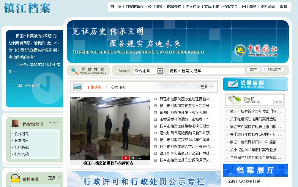 鎮(zhèn)江市檔案館建立于1959年1月,1987年9月鎮(zhèn)江市檔案處更名為檔案局,1997年局館合并,為市委、市政府直屬正處級(jí)事業(yè)單位,參照國家公務(wù)員制度管理?,F(xiàn)內(nèi)設(shè)辦公室(掛“行政服務(wù)處”的牌子)、法規(guī)宣教處、業(yè)務(wù)指導(dǎo)處、保管利用處(掛“鎮(zhèn)江市文件資料利用中心”的牌子)、征集編研處、信息技術(shù)處6個(gè)(科級(jí)建制)職能處室,下轄檔案咨詢服務(wù)中心。局(館)核定全額撥款事業(yè)編制24名,現(xiàn)有工作人員25名,其中研究館員4名、副研究館員1名。鎮(zhèn)江市檔案館于2011年6月晉升為國家一級(jí)綜合檔案館,目前館藏有清朝、民國和革命歷史時(shí)期的珍貴檔案,以及建國后機(jī)關(guān)、團(tuán)體、事業(yè)單位檔案20萬卷、資料1.9萬冊(cè)。局(館)不斷加強(qiáng)信息化建設(shè),推動(dòng)檔案管理現(xiàn)代化進(jìn)程,現(xiàn)目錄數(shù)字化200萬余條,全文掃描223個(gè)全宗,55278卷,1034萬余頁。從手檢到機(jī)檢,提高了查全率和查準(zhǔn)率。多年來,市委、市政府對(duì)檔案工作給予了高度重視,分別于2003年、2006年、2012年先后三次召開全市檔案工作表彰大會(huì),表彰全市檔案系統(tǒng)先進(jìn)集體和先進(jìn)個(gè)人,2006年以市委、市政府名義出臺(tái)了《關(guān)于加強(qiáng)和改進(jìn)檔案工作的意見》。局(館)先后三次被市委、市政府授予“鎮(zhèn)江市文明機(jī)關(guān)”、 “文明城市創(chuàng)建活動(dòng)先進(jìn)單位”、“普法教育工作先進(jìn)集體”、“國企改革三等功單位”等榮譽(yù)稱號(hào);全市檔案宣傳工作連續(xù)6年被江蘇省檔案局評(píng)為特等獎(jiǎng);局(館)黨支部連續(xù)5年被市級(jí)機(jī)關(guān)工委評(píng)為“先進(jìn)黨組織”,榮獲“2013-2015年度先進(jìn)基層黨組織”、“四星”級(jí)法治型、服務(wù)型先進(jìn)黨支部;市檔案學(xué)會(huì)榮獲市學(xué)會(huì)科普工作先進(jìn)獎(jiǎng)、鎮(zhèn)江市先進(jìn)社科組織、2016年市檔案館被評(píng)為“鎮(zhèn)江市社會(huì)科學(xué)普及示范基地”;2017年局(館)榮獲“2014—2016年度鎮(zhèn)江市文明機(jī)關(guān)”稱號(hào)。