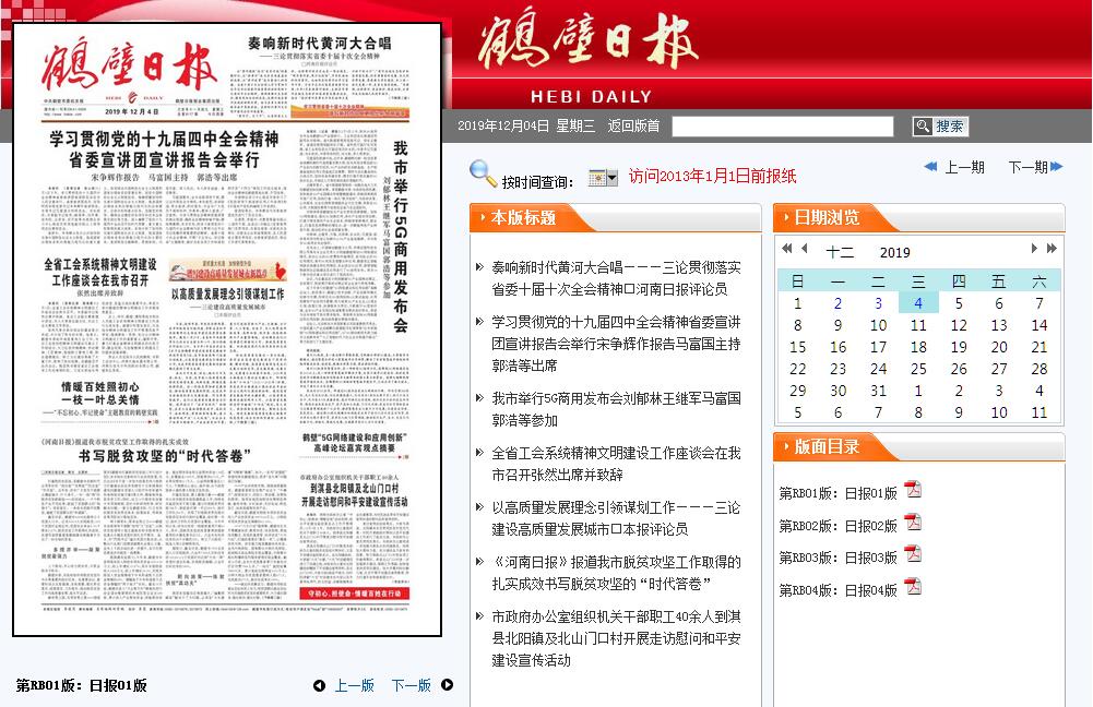 鶴壁日報電子版,鶴壁日報社是市委直屬事業(yè)單位,目前有職工205人,新聞等專業(yè)技術(shù)人員142人?!耳Q壁日報》是中共鶴壁市委機關(guān)報,創(chuàng)刊于1958年7月1日。由于國家進入三年困難時期,鶴壁日報于1961年1月31日停刊。1984年7月1日,???3年之久的鶴壁日報正式復刊。1998年1月1日,鶴壁日報出版對開大報,完成了向往已久的從小報到大報的歷史性跨越。近十幾年來,報社的各項事業(yè)得到了快速發(fā)展,2000年創(chuàng)辦了《淇濱晚報》(2009年更名為《淇河晨報》),2007年創(chuàng)辦了大河鶴壁網(wǎng)(2012年更名為鶴壁網(wǎng),2015年5月更名為鶴壁新聞網(wǎng)),2009年創(chuàng)辦了《鶴壁手機報》(2015年更名為河南手機報-鶴壁版),2010年籌資建設(shè)了一批高規(guī)格的黨報閱報欄,2015年創(chuàng)辦了《掌尚鶴壁》手機客戶端。鶴壁新聞網(wǎng)在全省18個地市黨報所辦網(wǎng)站的綜合排名中位居前六名。目前鶴壁日報社已擁有《鶴壁日報》、《淇河晨報》、鶴壁新聞網(wǎng)、河南手機報-鶴壁版、黨報閱報欄等傳統(tǒng)媒體和《掌尚鶴壁》手機客戶端,鶴壁網(wǎng)微博、遇鶴壁微信,鶴壁日報微博、微信,淇河晨報微博、微信等新媒體矩陣,截至目前,鶴壁日報社所屬的新媒體平臺總用戶數(shù)量已達到23萬人。此外,還擁有鶴壁日報社印刷廠和鶴壁啟明星商貿(mào)有限公司、鶴報禮儀文化傳媒有限公司、鶴壁掌控傳媒有限公司等企業(yè)。