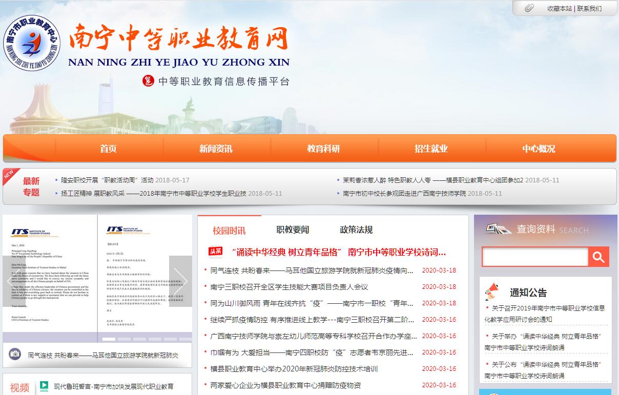 南寧中等職業(yè)教育網(wǎng)是南寧市職業(yè)教育中心創(chuàng)辦的南寧市中等職業(yè)教育門戶網(wǎng)站,是南寧市中等職業(yè)教育的綜合資訊平臺,主要為南寧市各中等職業(yè)學(xué)校提供新聞資訊、教育科研、招生就業(yè)等方面的信息服務(wù)。南寧市職業(yè)教育中心成立于2007年7月,地址位于南寧市興寧區(qū)蘇州路61-4號,直屬于南寧市教育局,機構(gòu)規(guī)格為正科級,實行全額撥款的經(jīng)費管理形式,編制27名,業(yè)務(wù)范圍主要是:負(fù)責(zé)全市中等職業(yè)教育教學(xué)指導(dǎo)、就業(yè)指導(dǎo)、信息服務(wù)和社區(qū)教育工作。為行使工作職能,南寧市職業(yè)教育中心設(shè)置了辦公室、教研部、就業(yè)部、信息部和社區(qū)教育部五個內(nèi)部機構(gòu)開展業(yè)務(wù),研究職業(yè)教育理論,開展就業(yè)指導(dǎo),建設(shè)南寧中等職業(yè)教育網(wǎng)、南寧市中職學(xué)校學(xué)生實習(xí)信息化管理平臺、南寧終身學(xué)習(xí)公共服務(wù)平臺。形成了一個體系,七個平臺的工作架構(gòu),構(gòu)建了南寧市職業(yè)教育、社區(qū)教育服務(wù)支撐體系,搭建了教育教研、師資建設(shè)(人才小高地和名師成長工作室)、校長工作研討、校企合作、就業(yè)指導(dǎo)、信息服務(wù)、社區(qū)教育等七個工作平臺,助推南寧市職業(yè)教育、社區(qū)教育發(fā)展。
