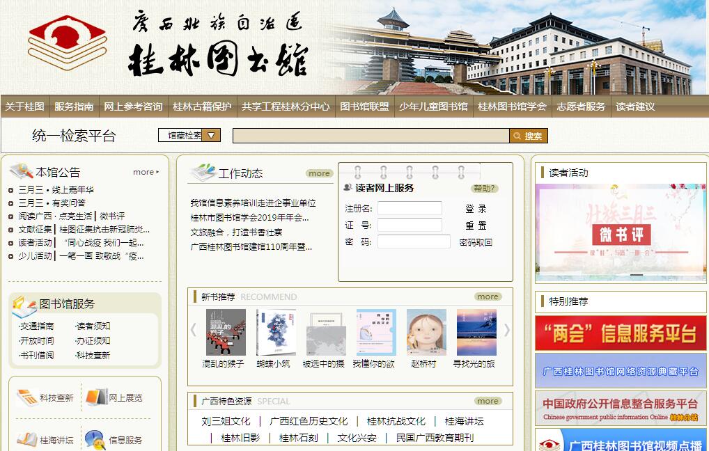 廣西壯族自治區(qū)桂林圖書館建于1909年(清宣統(tǒng)元年),是廣西建館最早的圖書館,也是全國建館最早的省級公共圖書館之一。原稱“廣西圖書館”、“廣西省第一圖書館”、“廣西壯族自治區(qū)第一圖書館”等名, 1980 年改為現(xiàn)名,仍為省館建制。擔(dān)負著廣西北片桂林市、柳州市、梧州市、賀州市、河池市和來賓市等6個市的各級公共圖書館及各系統(tǒng)圖書館(室)的業(yè)務(wù)輔導(dǎo)工作。廣西桂林圖書館是全國文化信息資源共享工程桂林分中心、國家數(shù)字圖書館省級分館,是全國人文社會科學(xué)普及基地、全國科普教育基地、全國古籍重點保護單位、廣西壯族自治區(qū)級古籍修復(fù)單位,是全國第一家直接獲得科技檢索查新資格的公共圖書館。館舍總面積5萬平方米,分為總館、安新分館和榕湖分館三部分。榕湖館舍建于1954年,坐落在風(fēng)景秀麗的榕湖之濱,是桂林市文物保護單位,2005年7月掛牌成立桂林少年兒童圖書館,同年得到美國明德圖書館基金會支持,建立桂林明德英文圖書館。安新館舍坐落在美麗的漓江之畔,于1991年對外開放??傪^位于臨桂新區(qū),是桂林 “一院兩館”的組成部分,桂林標(biāo)志性文化建筑之一。我館是廣西保存和提供文獻資源利用的重要場所,館藏資源豐富,極具地方特色,現(xiàn)有館藏文獻291萬冊,其中少數(shù)民族舊文獻和地方歷史文獻收藏豐富,館藏抗戰(zhàn)時期桂林出版物,是館藏一大特色。自建有廣西抗戰(zhàn)文化、桂林石刻、桂林舊影等地方專題特色數(shù)據(jù)庫,購有報紙、期刊、學(xué)術(shù)論文等數(shù)據(jù)庫資源供讀者使用。我館全年候?qū)ν忾_放,實行全免費服務(wù),提供文獻資源借閱與傳遞、信息咨詢、科技查新、展覽講座、文化展示、社會教育培訓(xùn)、數(shù)字化網(wǎng)絡(luò)服務(wù)等,為公眾營造學(xué)習(xí)、研究、交流空間。常年開展社會閱讀推廣活動,其中公益課堂、快樂一小時、悅動·科學(xué)、悅讀1+1、谷雨詩會、讀書沙龍、桂海講壇等已成為有一定影響的公益服務(wù)品牌。我館1988年組織的 “桂林市圖書讀者協(xié)會”、 2005年引入的“桂林英語角”等志愿者服務(wù)團隊具有良好的社會影響力,分別于2012年、2014年被文化部評為基層文化志愿服務(wù)示范項目。近十余年來,廣西桂林圖書館事業(yè)取得長足發(fā)展,多次獲得國家文化部、自治區(qū)、桂林市的表彰和獎勵。作為公共文化服務(wù)體系的重要組成部分,我館將充分發(fā)揮公共圖書館的服務(wù)優(yōu)勢,創(chuàng)新服務(wù)方式,提高服務(wù)質(zhì)量,以優(yōu)質(zhì)的公益服務(wù)回饋社會。